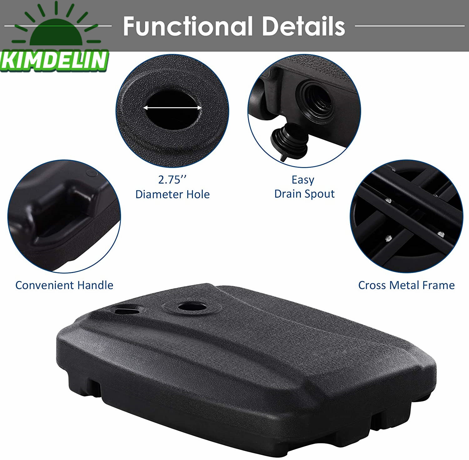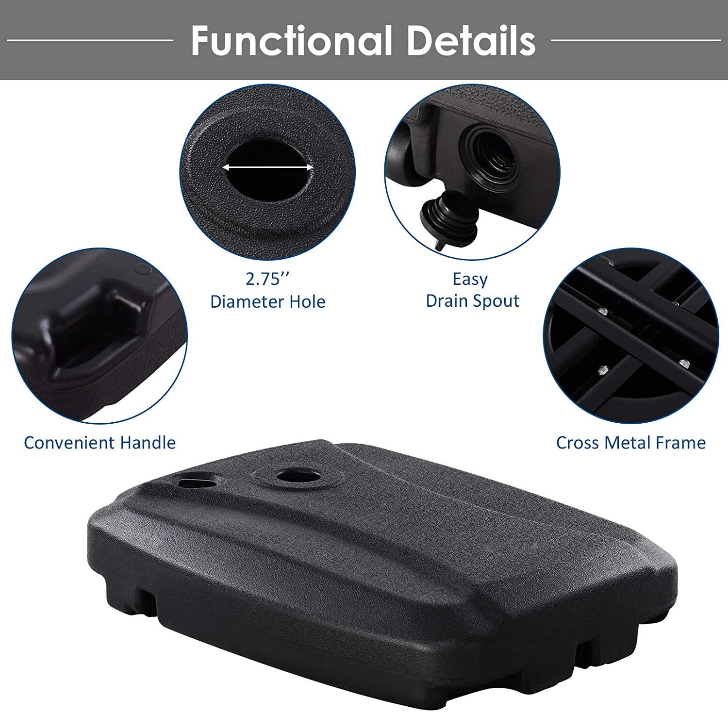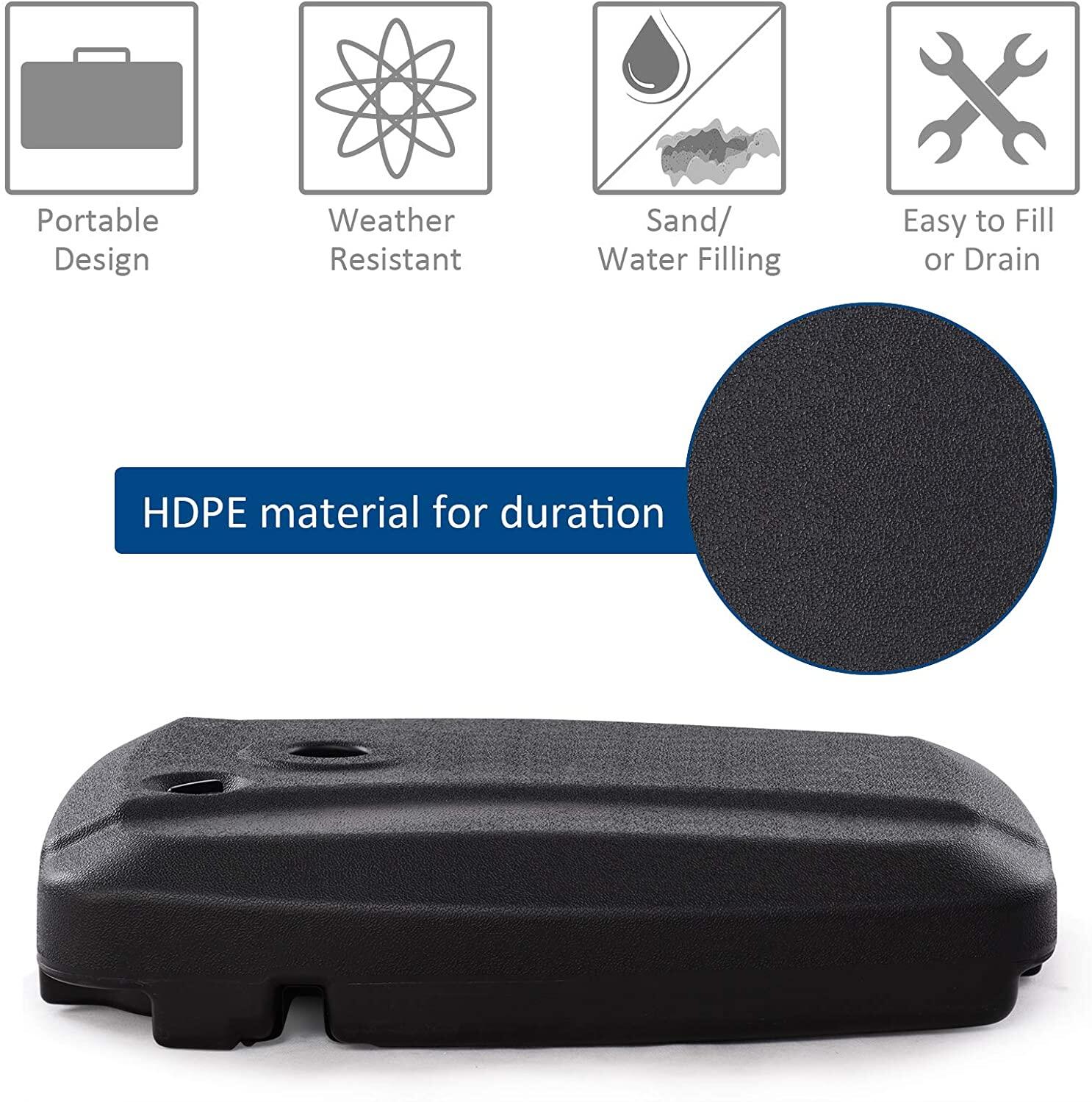 1、Durable Design: The parasol stand features the flexibility, antifreeze and low temperature resistance.2、Low Temperature Resistance: The parasol stand features slow oxidation rate, low temperature resistance, stable physical properties.3、Abrasion Resistance: The parasol stand features enhanced water filled hole, excellent plastic material, not easy to abrase.4、Smooth Design: The parasol stand features the smooth and tearing-resistant excellent materials, and it is made of excellent materials, so the hard objects are not easy to damage it.5、High Temperature Resistance: The parasol stand features the high temperature resistance and long-term sun resistance to be not easy to damage, and it features the anti-oxidation materials, long service life.