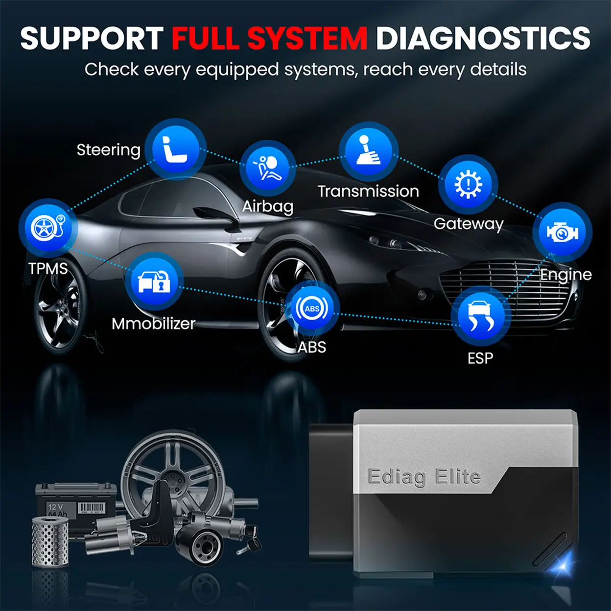 Ediag Elite is an innovative diagnostic tool that, as a pocket sized diagnostic device, can turn a smartphone into an intelligent scanning diagnostic tool for cars. Ediag Elite integrates multiple functions and connects to the OBD2 port of the car. Through the EDIAG app, diagnostic scans can be performed to accurately locate vehicle faults or diagnose vehicle maintenance.
