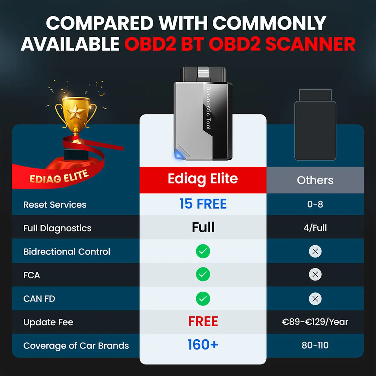 Compatible with for GM, Ford, Toyota, Chrysler, Honda, Mazda, Nissan, Mitsubishi, Hyundai, KIA with standard OBD2 port from 1996 to newer. More car brands and features will be released gradually. Newest Ediag Elite scanner supports CANFD Protocol and FCA cars.
