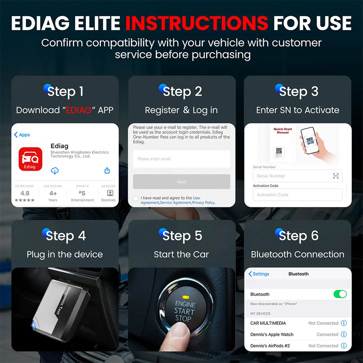 EDIAG Elite has an exclusive "EDIAG" app which compatible with Android &iOS phones. Recommend to connect WIFI to download App and software to save mobile data. Activation procudure: Download APP--Register User Account--Login Account--Personal Center--Activation--Enter the activation code, the software will be automatically update. Any activation issues, please send SN to us and we will provide a new activation code. Ediag elite may take few minutes to read all equipped systems the first time diagnose your car, please be patience. Or you can select single system to quickly process diagnose.