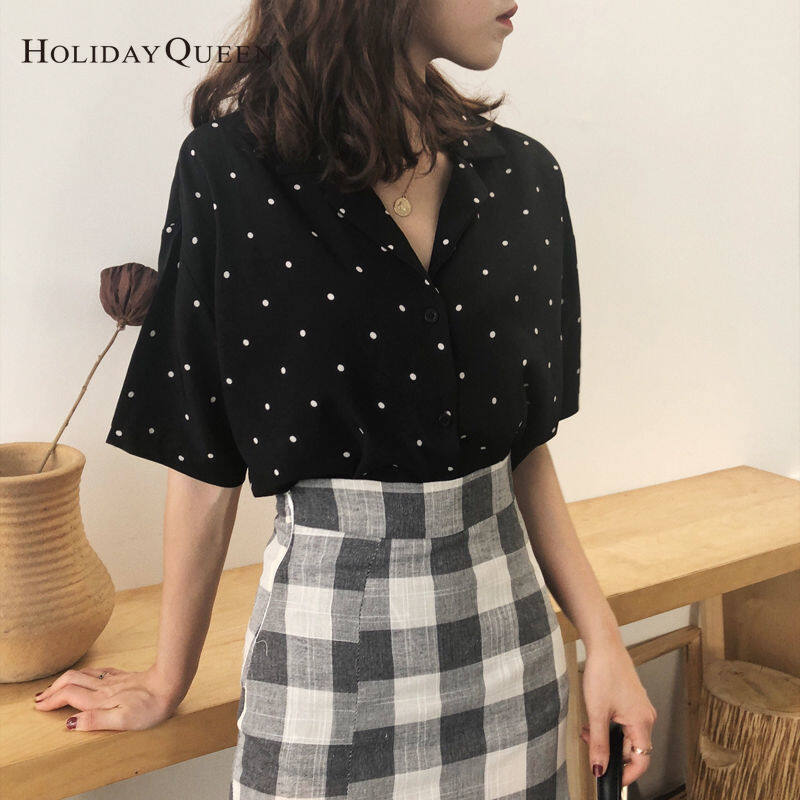 HolidayQueen Summer Dress Korean Version All-match Polka Dot Short-sleeved Shirt Top Women's Slim Suit Collar Single-breasted ShirtWomen's clothing HQP0899