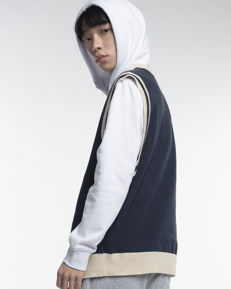 Regular Knitted Round Neck Varsity Vest With Asymmetrical Contrast Coloured Neckline and Hem. Comes with CREATIVE BOLD Slogan at the front. Made of cotton.