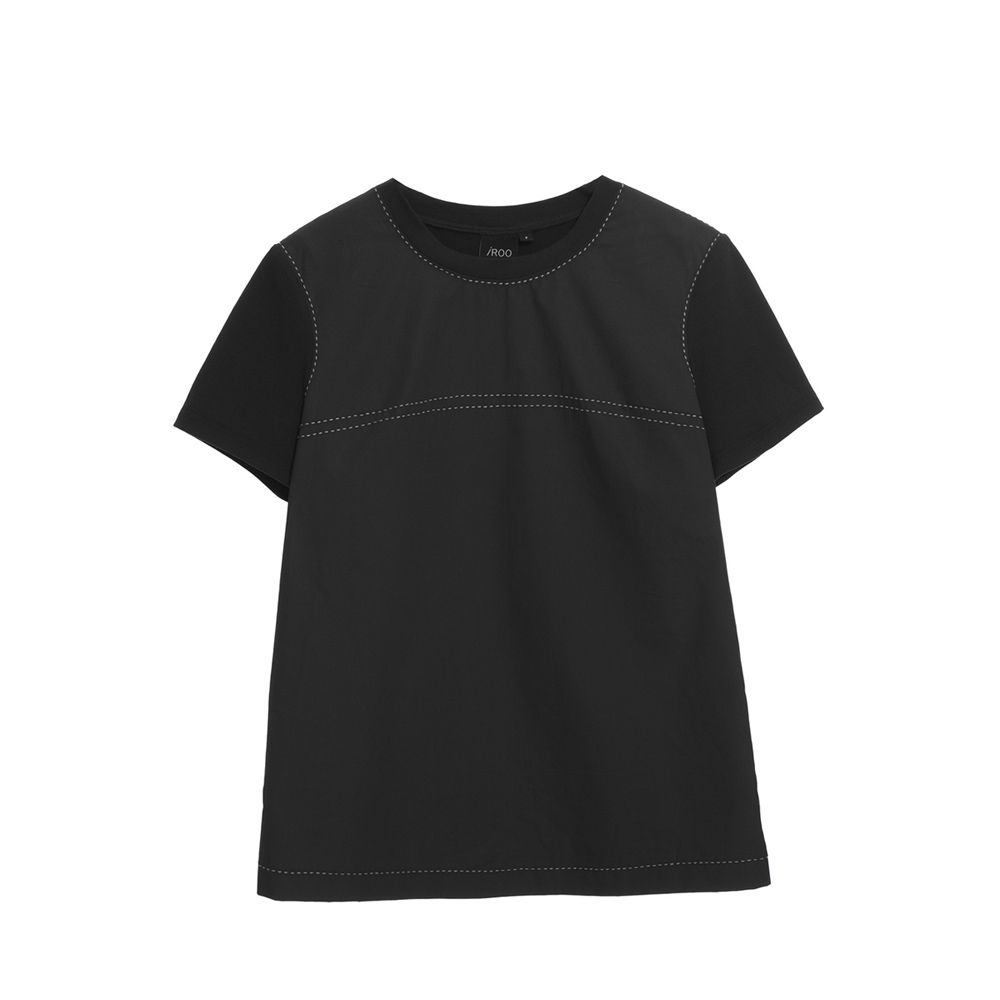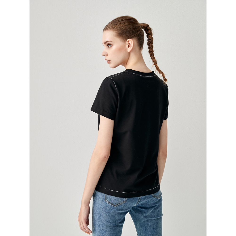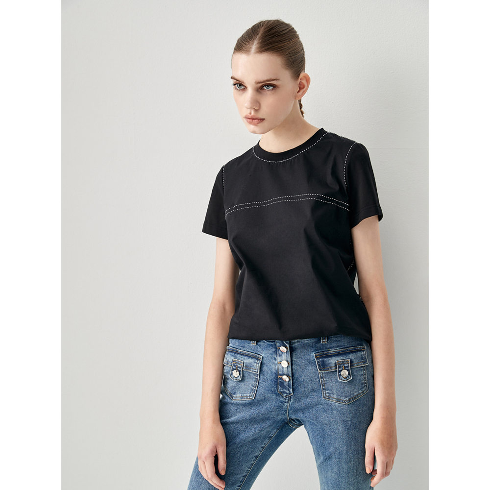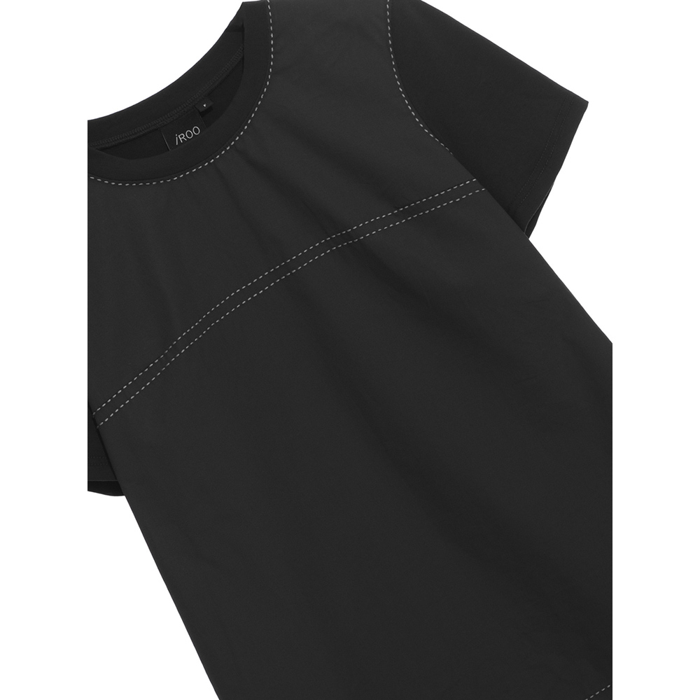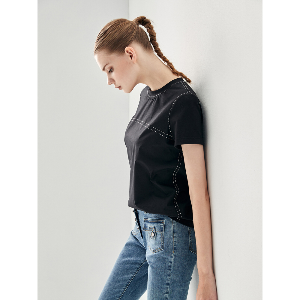iROO Women Fashion Basic Black Tee With Contrast White Stitching Detail