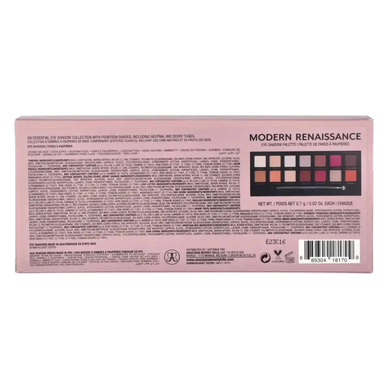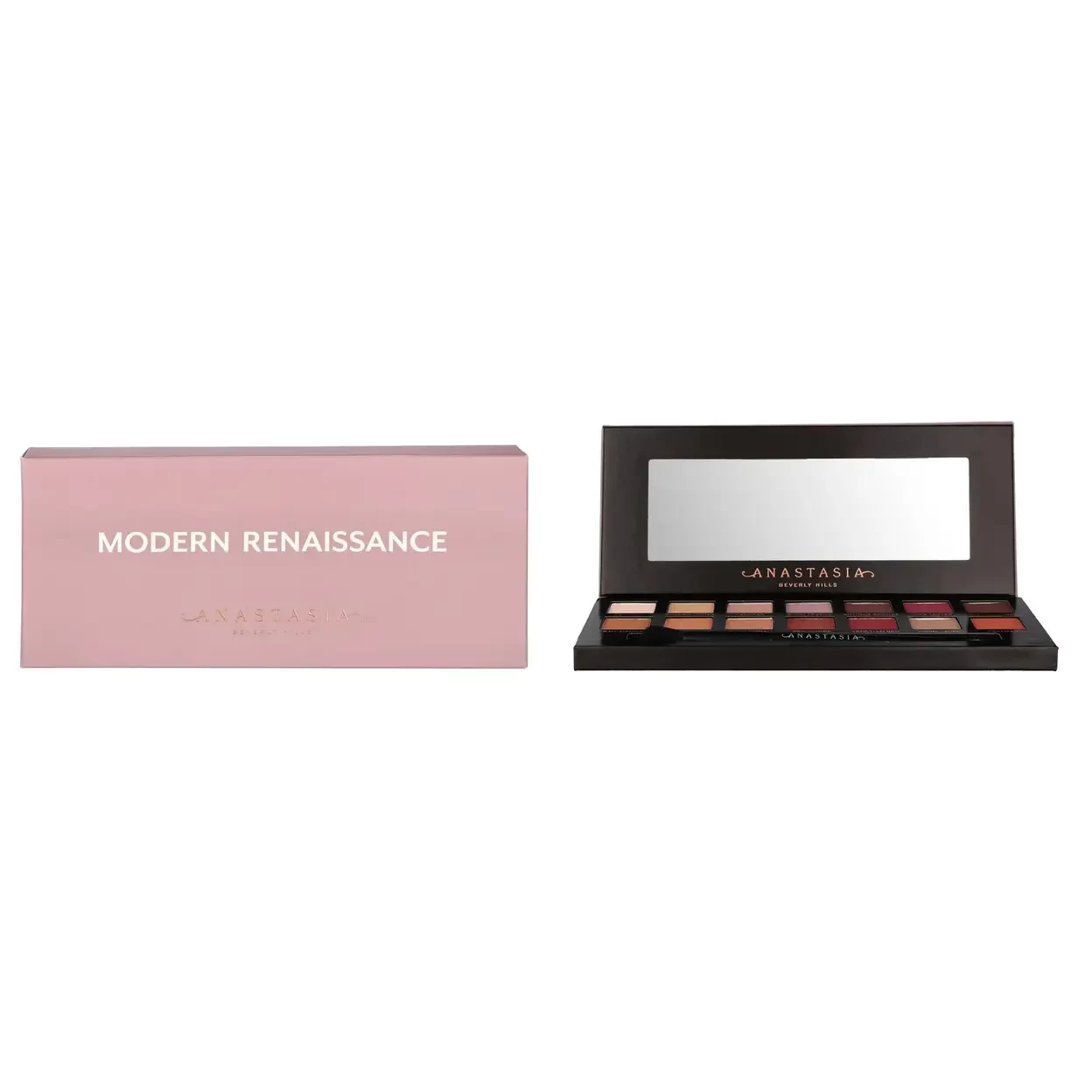 This product Anastasia Beverly Hills Modern Renaissance Eyeshadow Palette (total 9.8 g) is a professional eye shadow palette inspired by Renaissance art, containing 14 full-pigment shades. It offers a curated mix of warm neutrals, earthy tones, berry and red hues in ultra-matte, satin and metallic finishes. The velvety, blendable formula delivers intense color payoff while remaining easy to layer and blend. Encased in travel-friendly packaging with a large mirror and dual-ended brush, it allows creation of endless eye makeup looks from everyday soft to bold, statement styles.