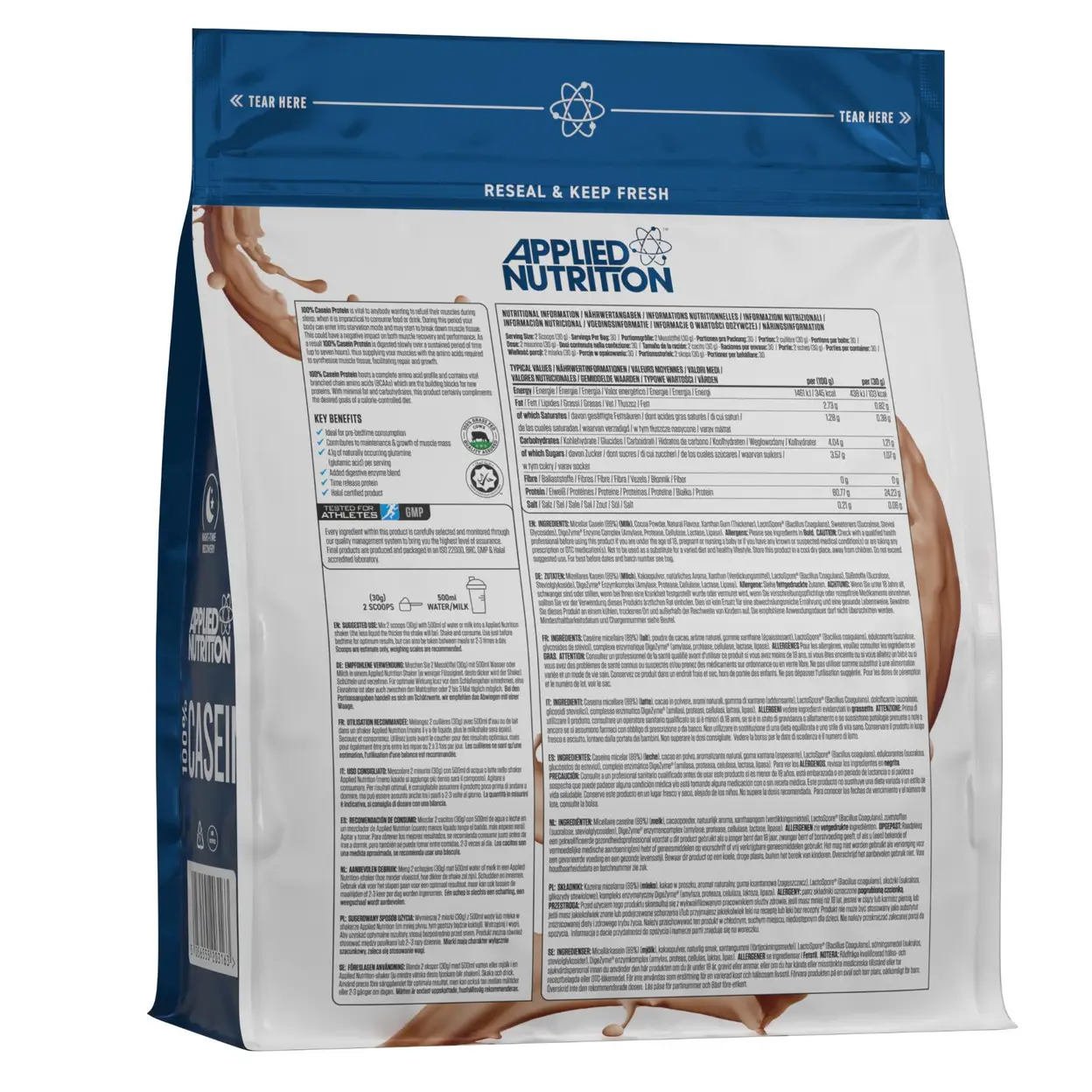 Micellar Casein (89%) (MILK), Cocoa Powder, Flavour, Xanthan Gum, LactoSpore®, Sweetener (Sucralose), DigeZyme®, Salt, Stevia Reb A 97%.