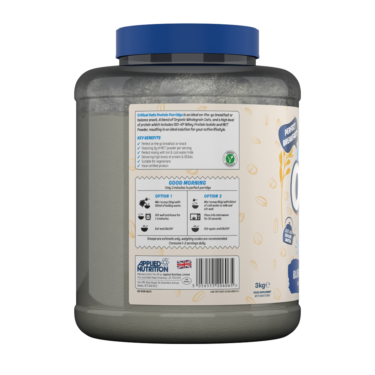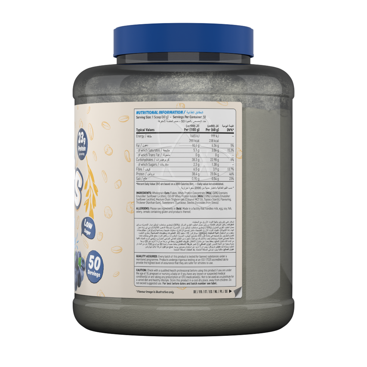 Wholegrain OATS Flakes, WHEY Protein Concentrate (MILK) (30%) (Contains Emulsifier: Sunflower Lecithin), ISO-XP WHEY Protein Isolate (MILK) (10%) (Contains Emulsifier: Sunflower Lecithin), Medium Chain Triglycerides (Coconut MCT Oil, Tapioca Starch), Flavouring, Thickener (Xanthan Gum), Sweeteners (Sucralose, Steviol Glycosides from Stevia).
