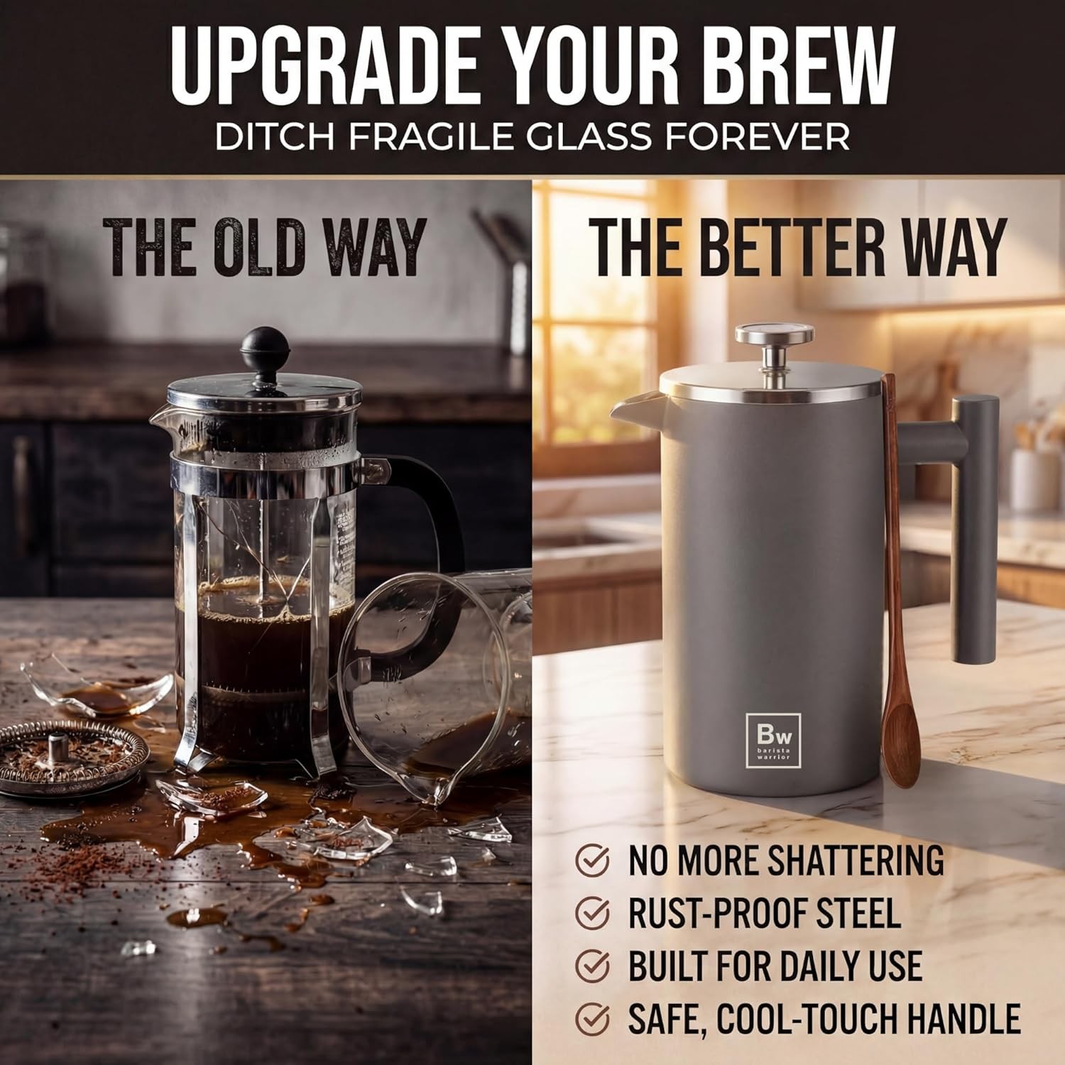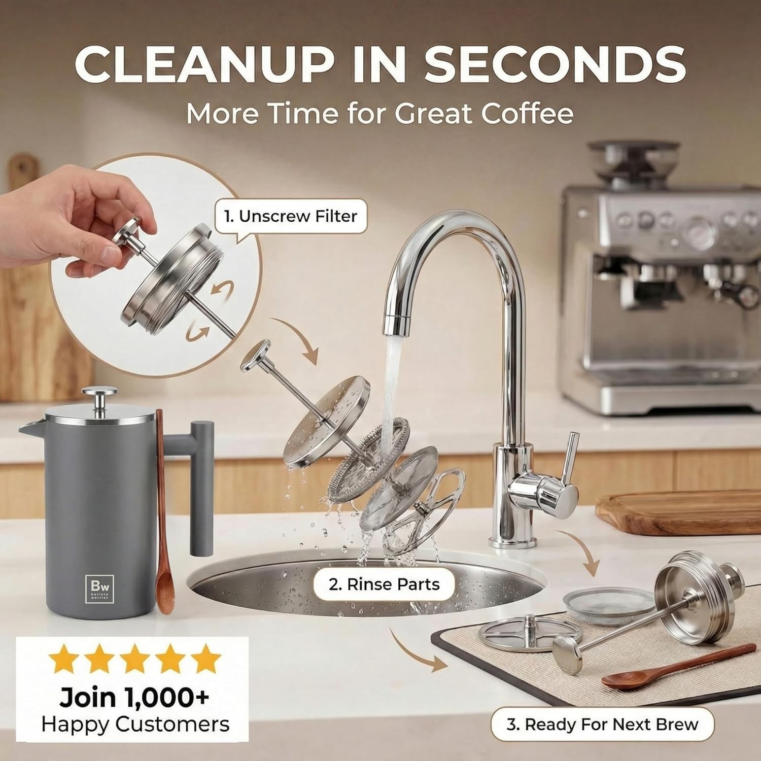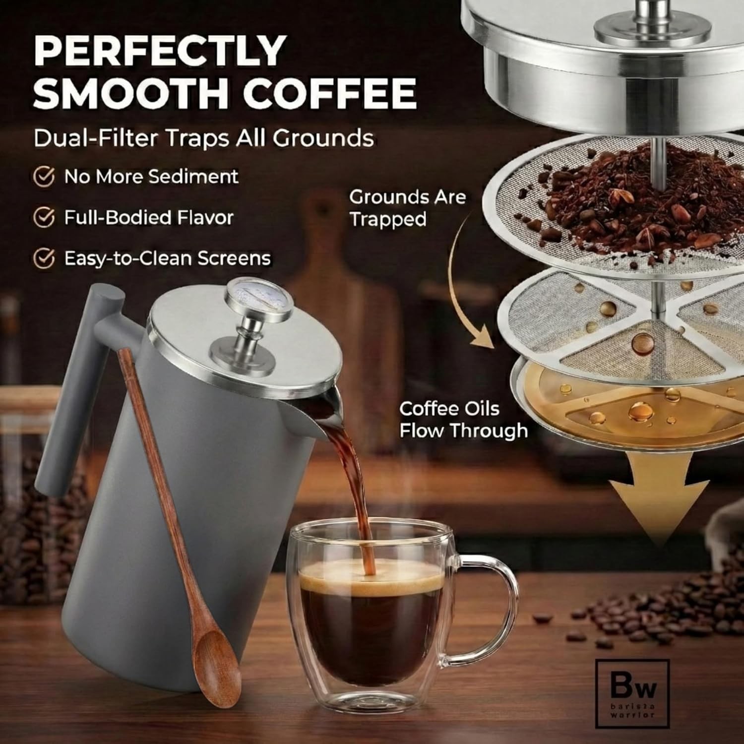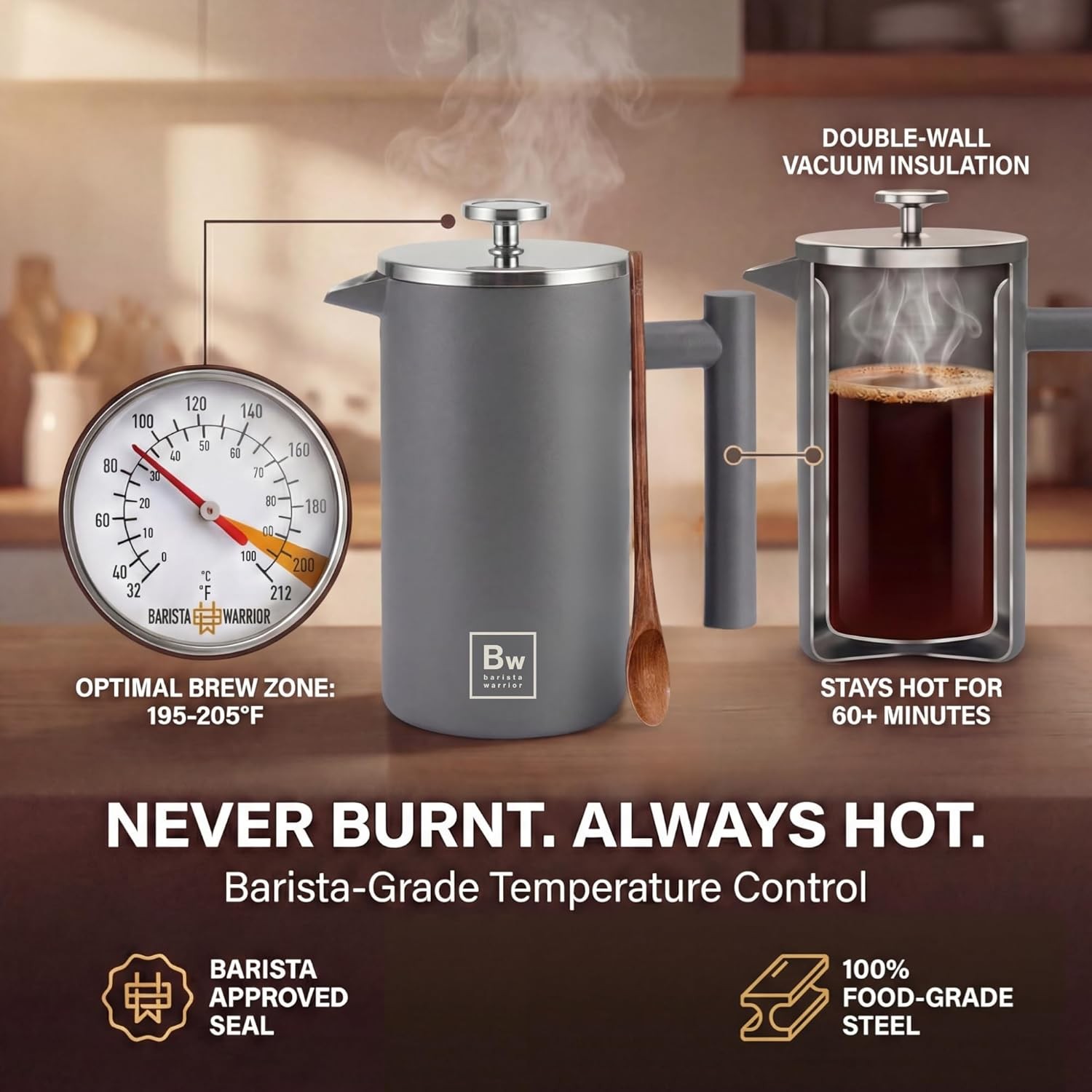 Barista Warrior French Press Coffee Maker Stainless Steel with Built-In Thermometer - Insulated Double Wall Design, Dual Filter System, Stay-Cool Handle & Wood Spoon - Grey