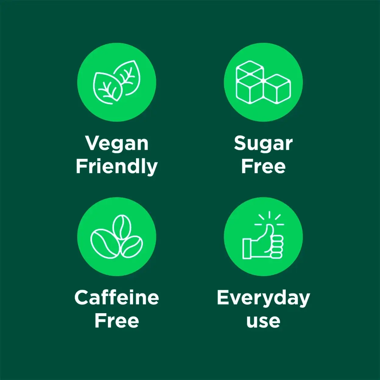 Suitable for vegans and free from caffeine, aspartame, sugar, and artificial colours