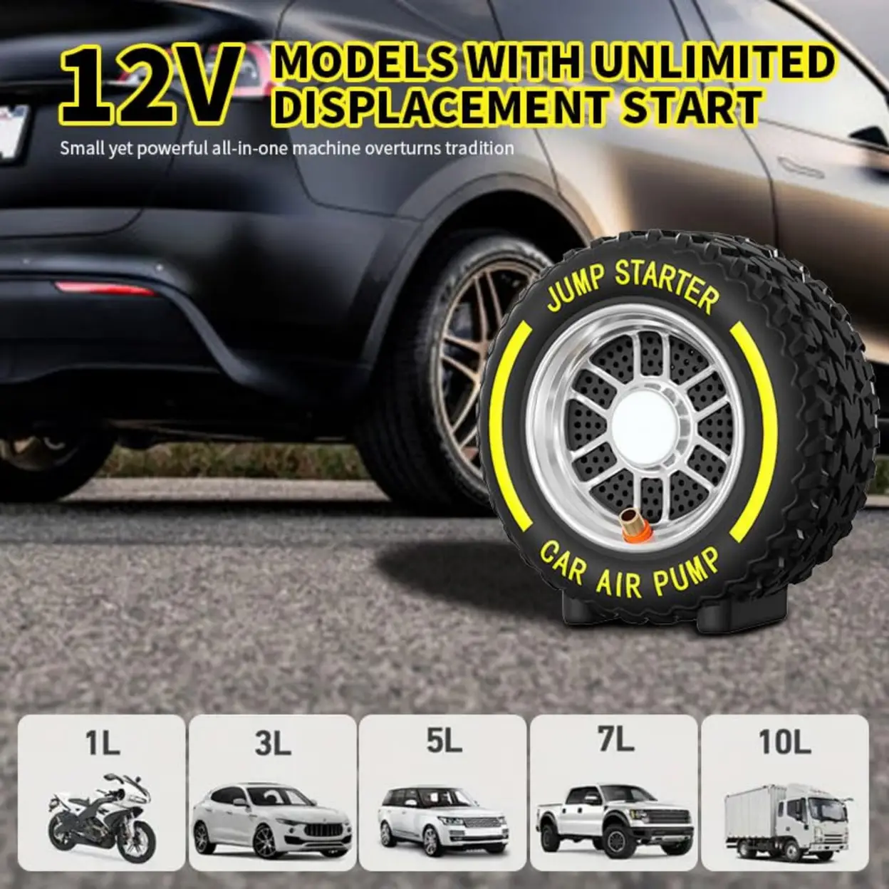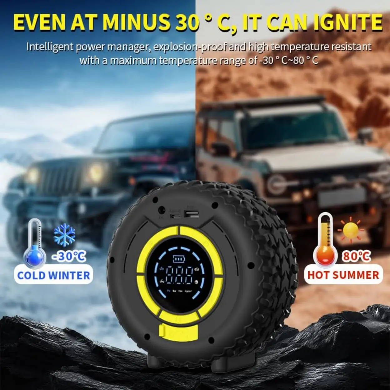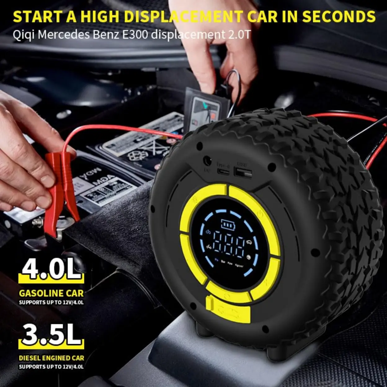 120W Multifunction Booster: Powerful 120W battery booster for easy starting of 12V petrol/diesel vehicles. Compatible with cars, motorcycles, pick-ups and light trucks. Operates even at temperatures ranging from -20°C to 60°C. 150 PSI air compressor: Built-in 150 PSI compressor with 5 modes, PSI/BAR/KPA, auto shut-off and 4 nozzles. Fast and accurate inflation for tyres, balls and leisure accessories 8000 mAh Power Bank: Built-in 8000 mAh external battery with 4 high-capacity cells, ideal for charging smartphones, tablets or portable devices in emergencies Multifunction LED & Smart Display: Ultra-bright LED lamp (light/flash/SOS). Digital display showing air pressure, mode and battery level for easy and safe use Compact, Safe and Portable: Lightweight 600 g design, mini dual display LCD screen. Easy to carry/store. Included: USB-C, inflation hose, storage bag and adapter nozzles