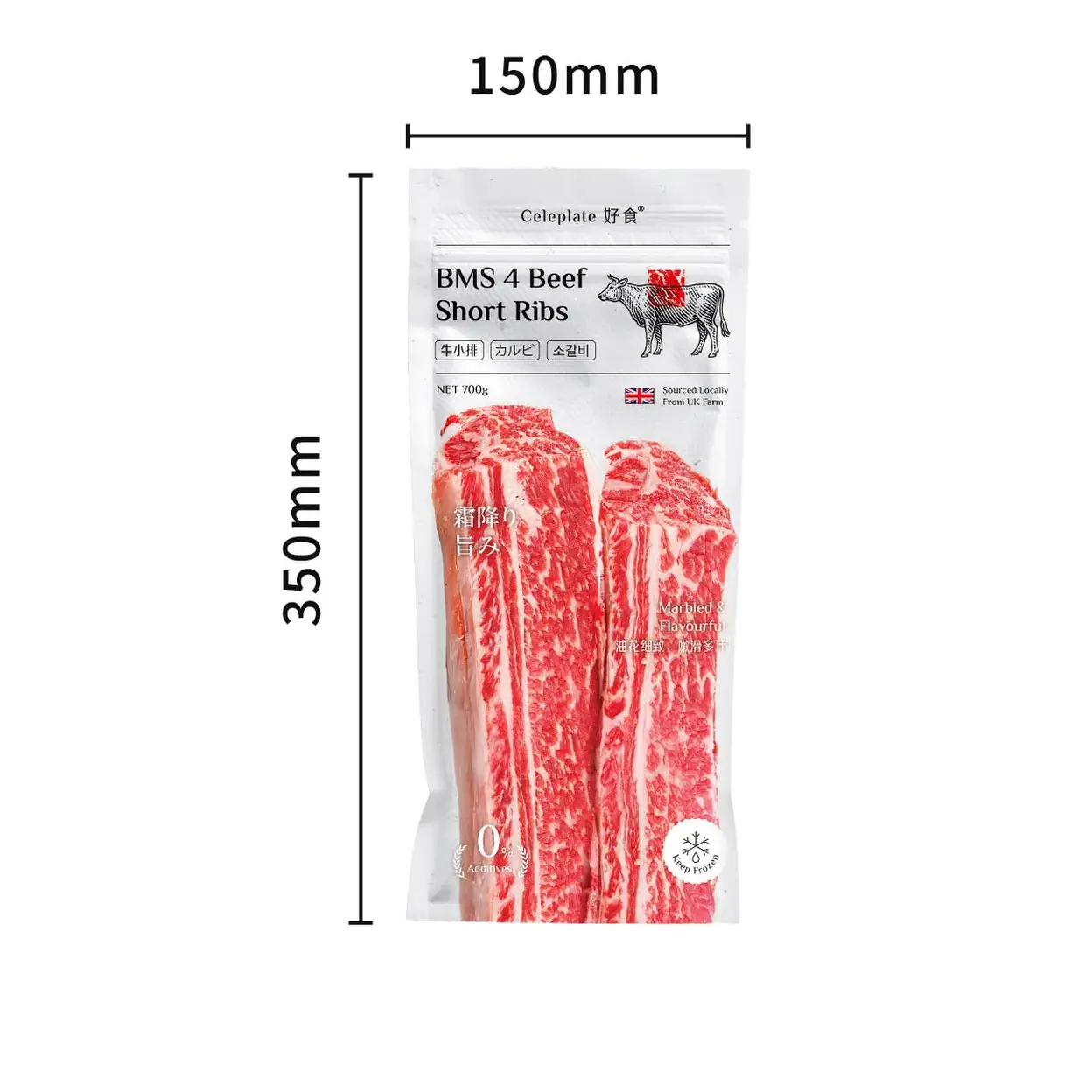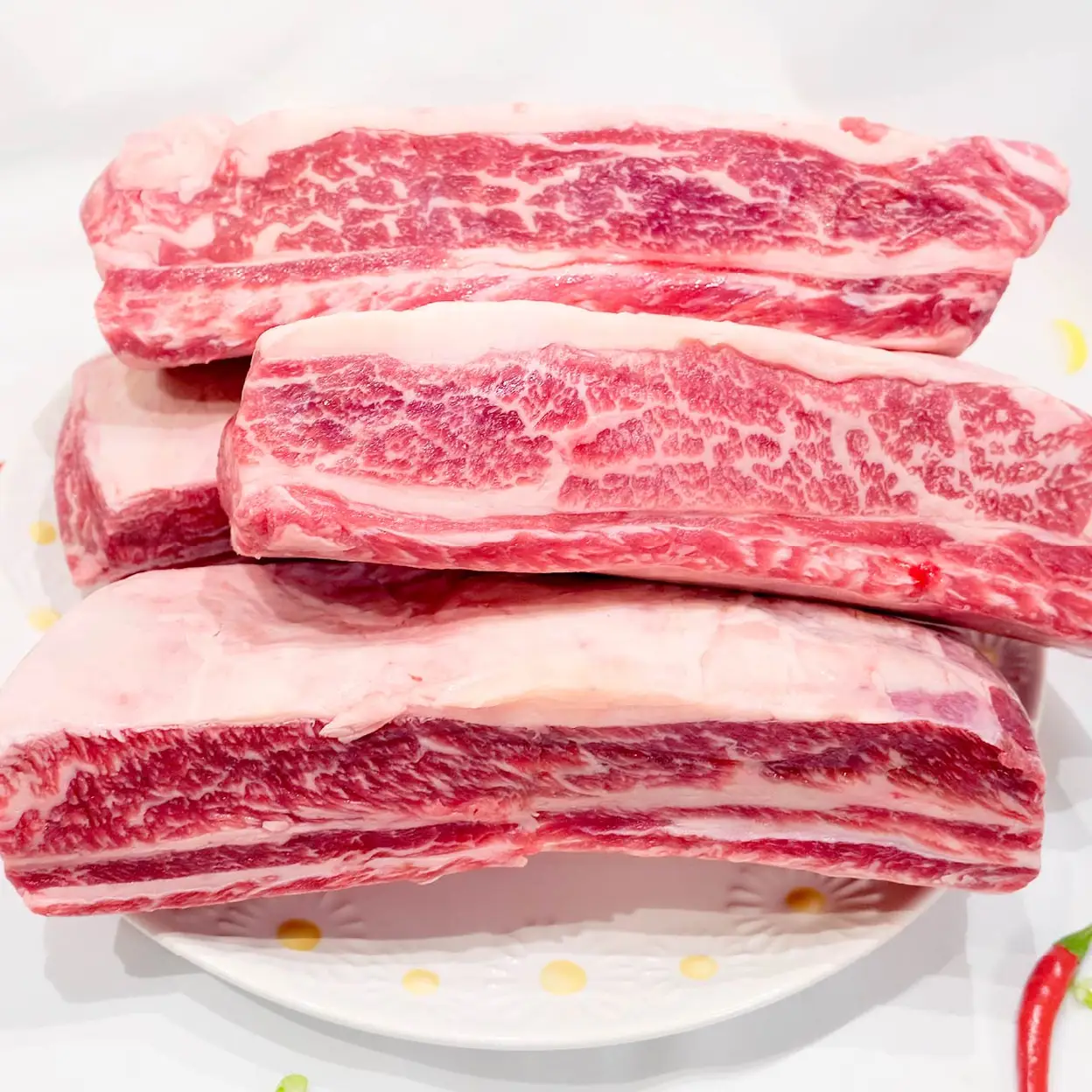 Premium bone-in beef short ribs with a Beef Marbling Score (BMS) of 4 for exceptional tenderness and juiciness.