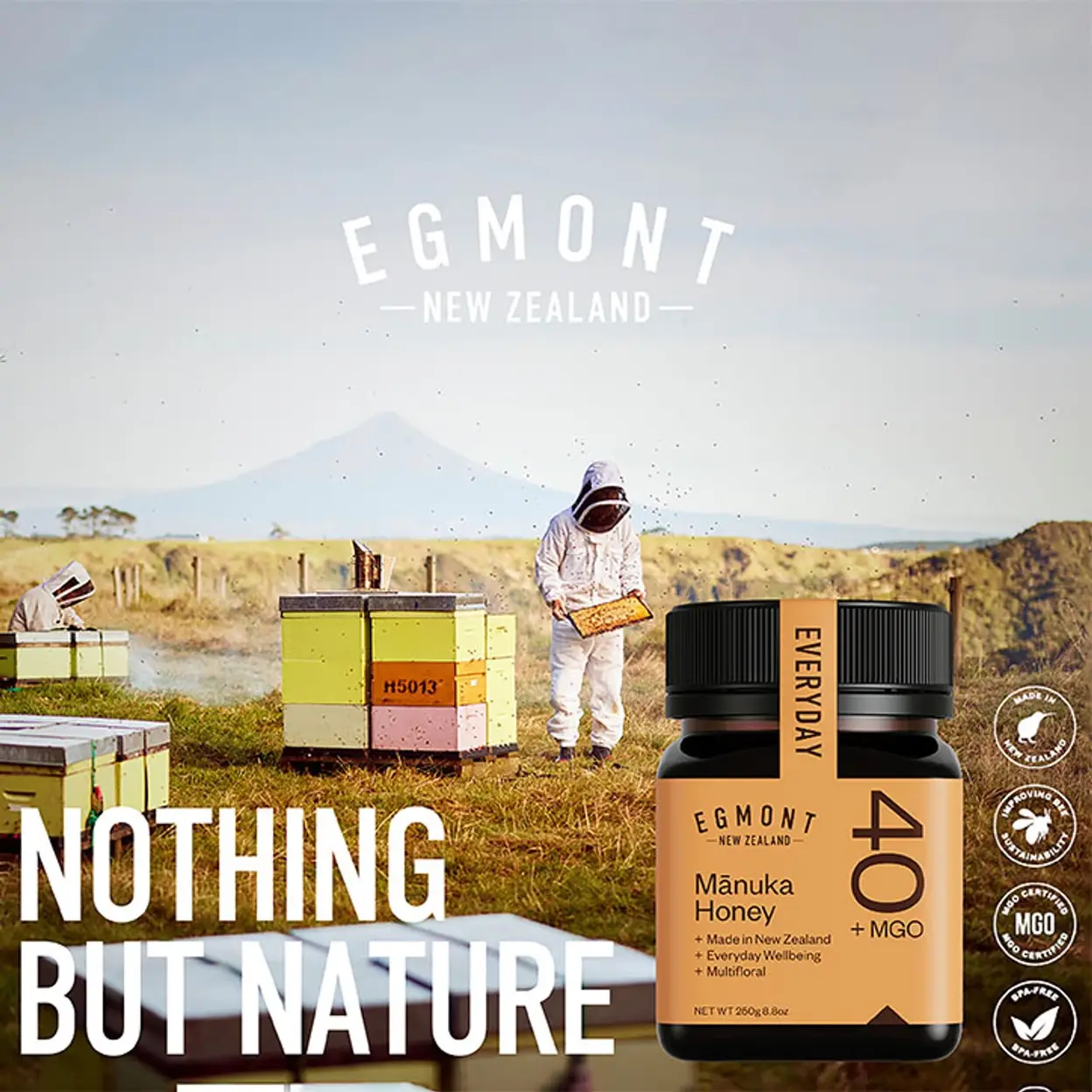 Egmont Honey MGO 40+ Multifloral Manuka Honey is sustainably harvested from the wild forests of South Taranaki, where bees forage on native Manuka bushes and surrounding flora. This 250g jar delivers a smooth, velvety texture with a rich floral sweetness.