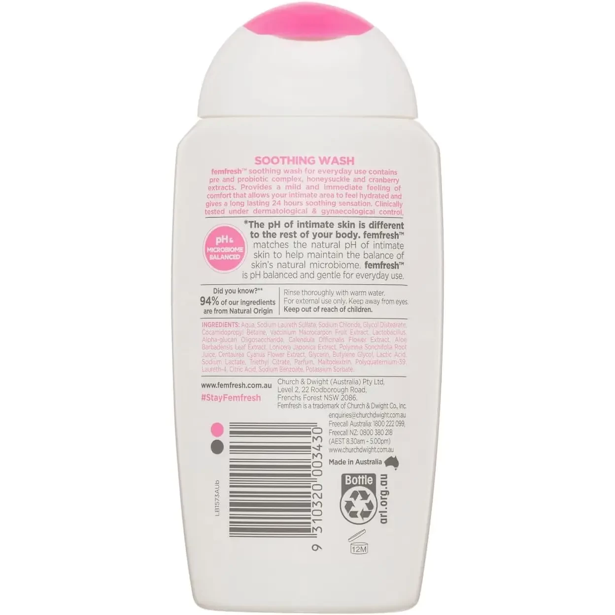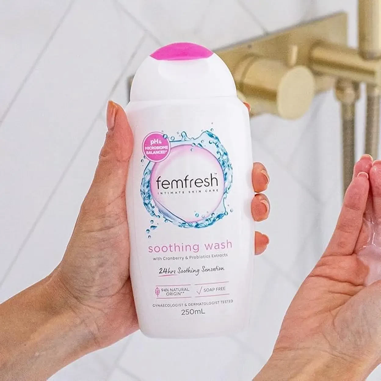 Femfresh Soothing Intimate Wash 250ml is a gentle, everyday solution for feminine hygiene. Crafted with 94% natural origin ingredients, including cranberry extract and probiotics, this wash soothes, hydrates, and helps strengthen your intimate skin¡¯s natural defences. Its soap-free, pH-balanced formula is designed to match the natural environment of intimate skin, supporting the skin¡¯s microbiome and providing 24-hour hydration for lasting comfort. Dermatologically and gynecologically tested, it is suitable for daily use and leaves you feeling fresh, comfortable, and confident. Ideal for those seeking a natural, gentle, and effective approach to intimate care.