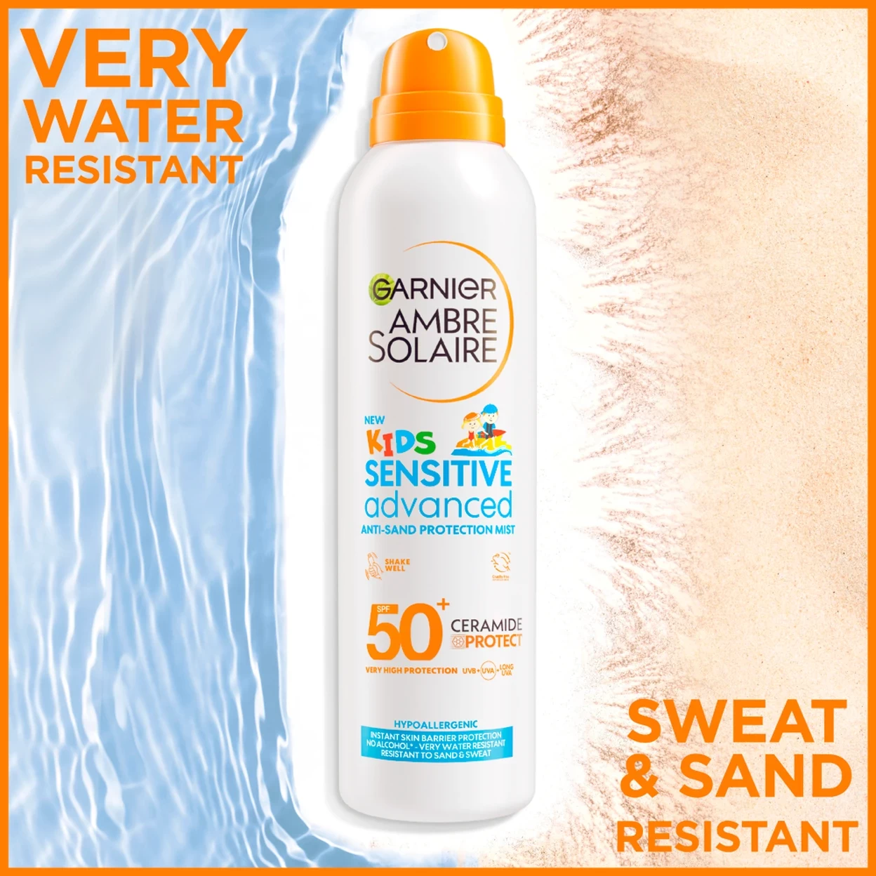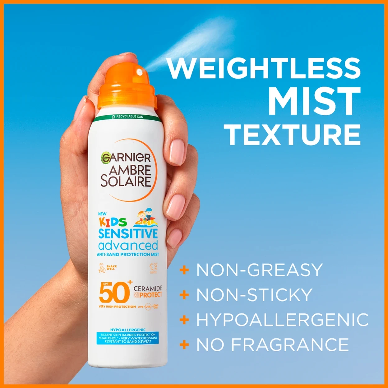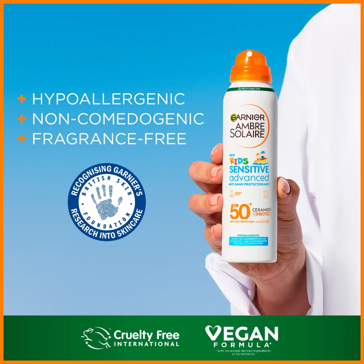 This product Garnier Ambre Solaire SPF 50+ Sensitive Advanced Kids Anti-Sand Mist 150ml immediately protects your kids from both short and long-term sun-induced damage. This very high protection sunscreen has a unique sand repelling action, so families everywhere can say no to that itchy sand feeling on skin. The fragrance-free lotion is especially developed for kids' sensitive skin and is hypoallergenic, to minimise allergy risk. With Ceramide, providing UVA and UVB protection and instant skin barrier function protection. The formula is non-greasy and fast-absorbing, is very water resistant and resistant to sand and sweat. The spray format allows you to protect your kids' skin from the sun quickly and easily. It can be used on body and face. The photostable formula has been tested under paediatric control and conforms 100% to European recommendations for protection against the harmful effects of UVA and UVB rays. Always keep babies and young children out of direct sunlight and protect your kids with a hat, t-shirt, and sunglasses as well as sun cream. Garnier suncare research is recognised by the British Skin Foundation.