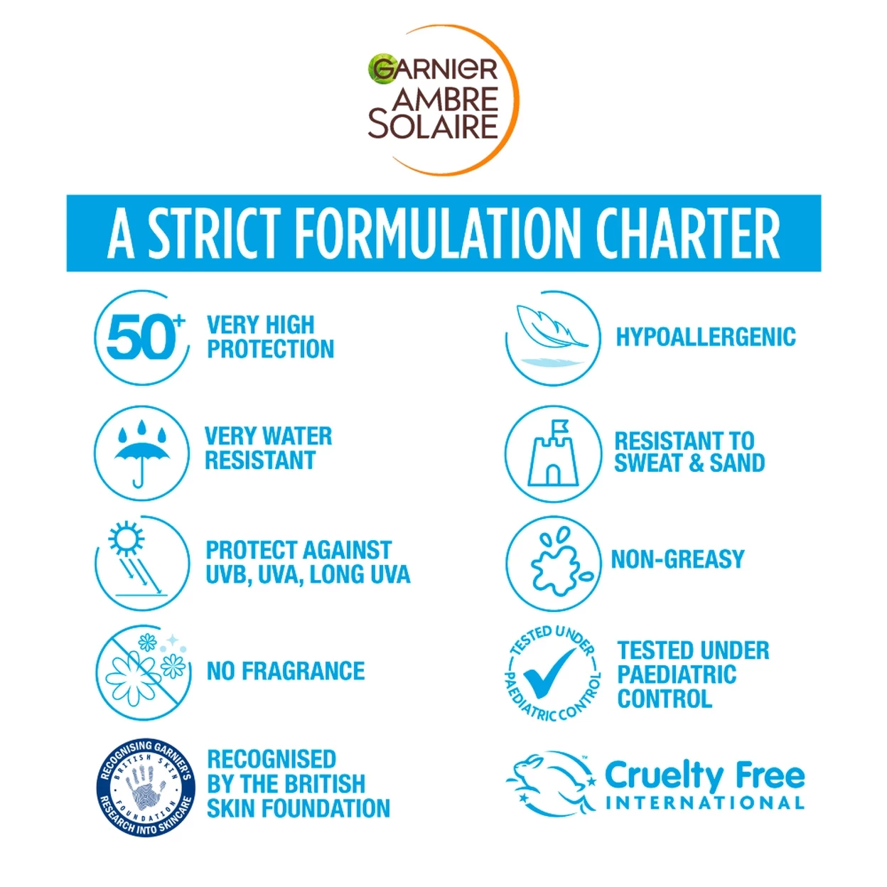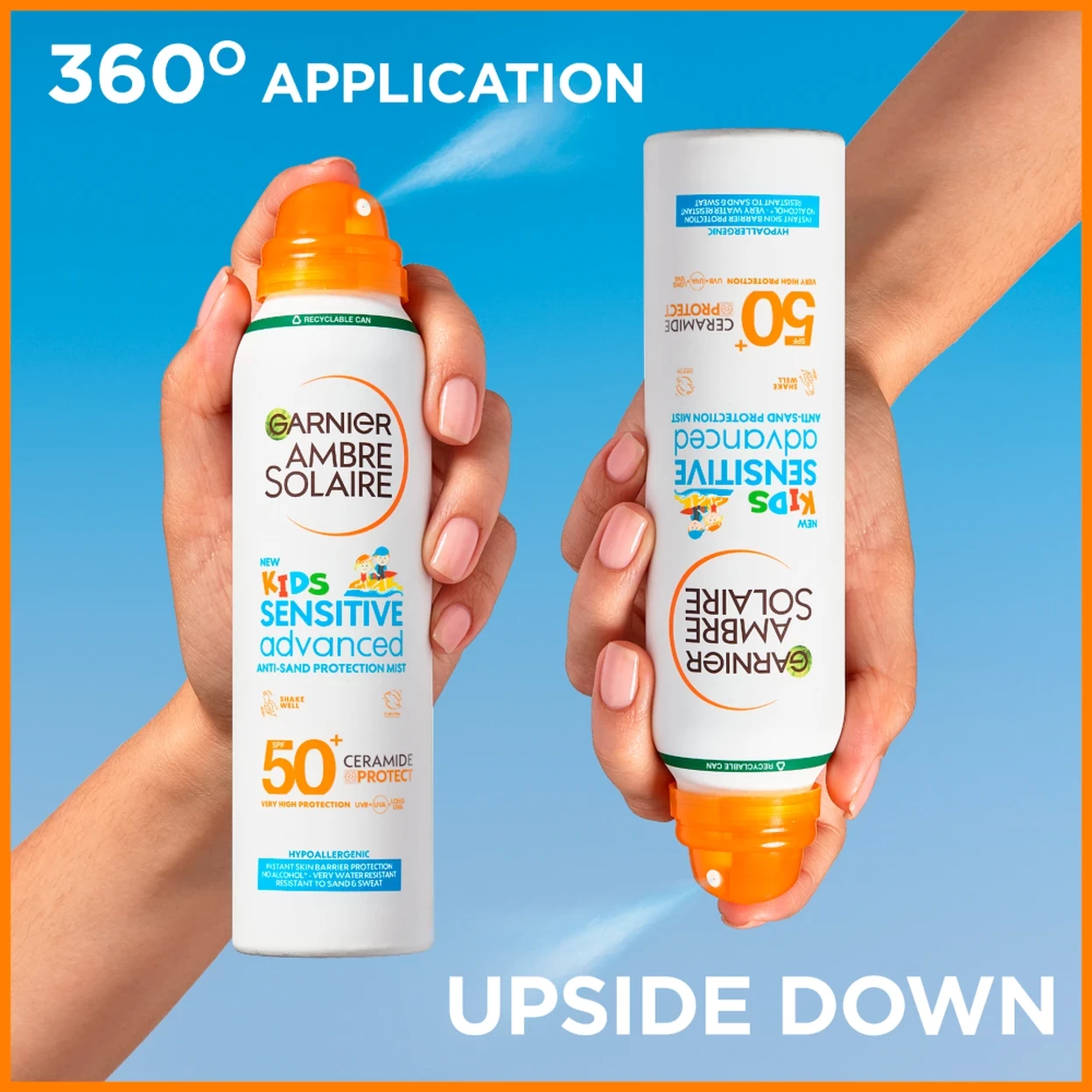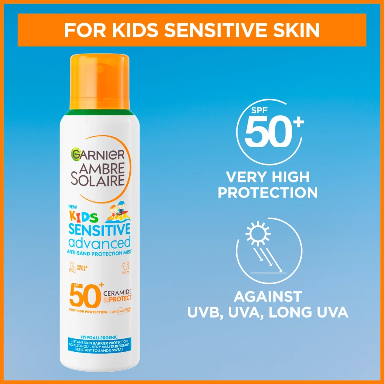 This product Garnier Ambre Solaire SPF 50+ Sensitive Advanced Kids Anti-Sand Mist 150ml immediately protects your kids from both short and long-term sun-induced damage. This very high protection sunscreen has a unique sand repelling action, so families everywhere can say no to that itchy sand feeling on skin. The fragrance-free lotion is especially developed for kids' sensitive skin and is hypoallergenic, to minimise allergy risk. With Ceramide, providing UVA and UVB protection and instant skin barrier function protection. The formula is non-greasy and fast-absorbing, is very water resistant and resistant to sand and sweat. The spray format allows you to protect your kids' skin from the sun quickly and easily. It can be used on body and face. The photostable formula has been tested under paediatric control and conforms 100% to European recommendations for protection against the harmful effects of UVA and UVB rays. Always keep babies and young children out of direct sunlight and protect your kids with a hat, t-shirt, and sunglasses as well as sun cream. Garnier suncare research is recognised by the British Skin Foundation.