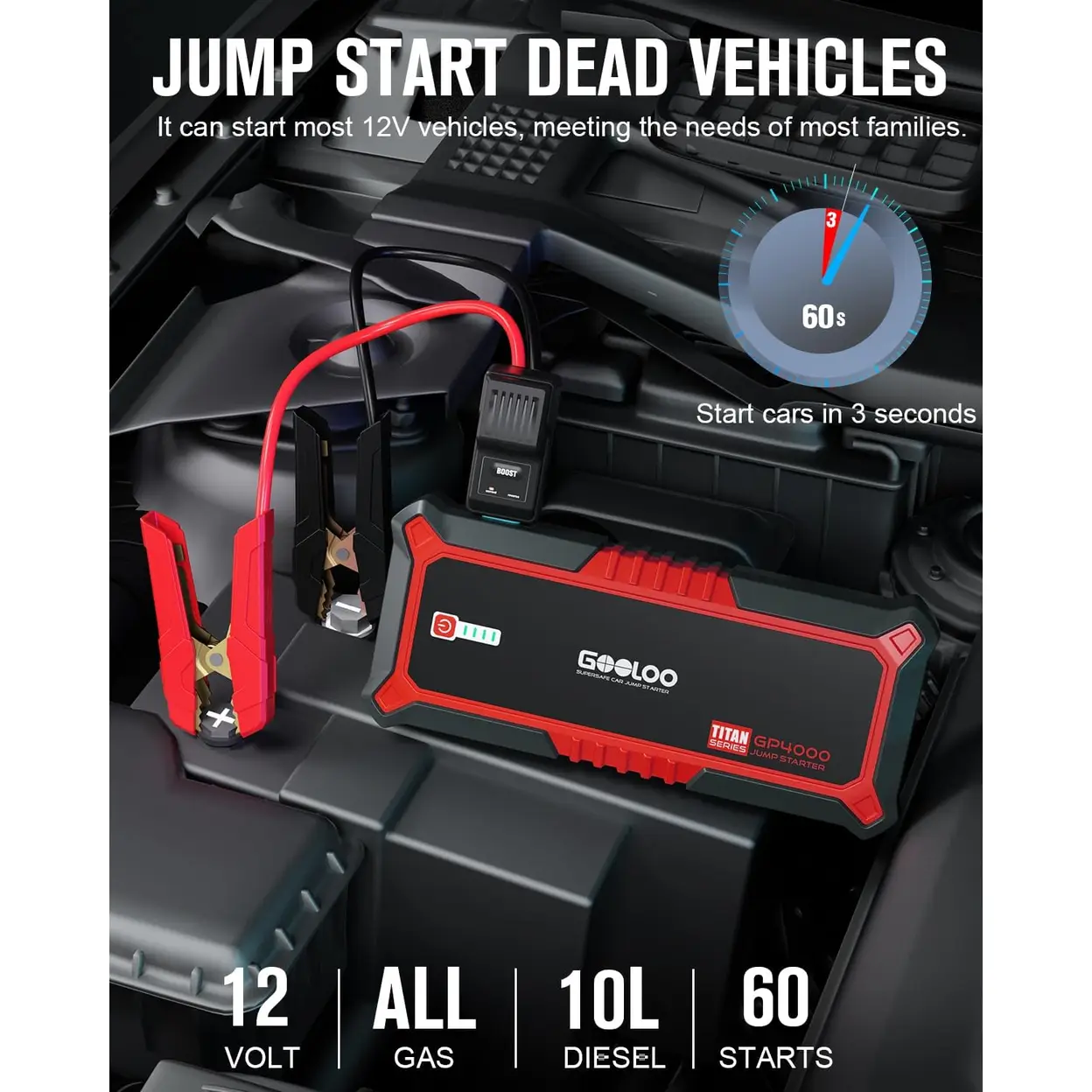 Emergency Life Saver - The GOOLOO GP4000 car jump starter provides quick vehicle jump-starting capabilities, ensuring that you're not stranded and exposed to potential dangers for an extended period of time. With a full charge, it can jump-start most vehicles over 60 times, offering reliable assistance in emergency situations.