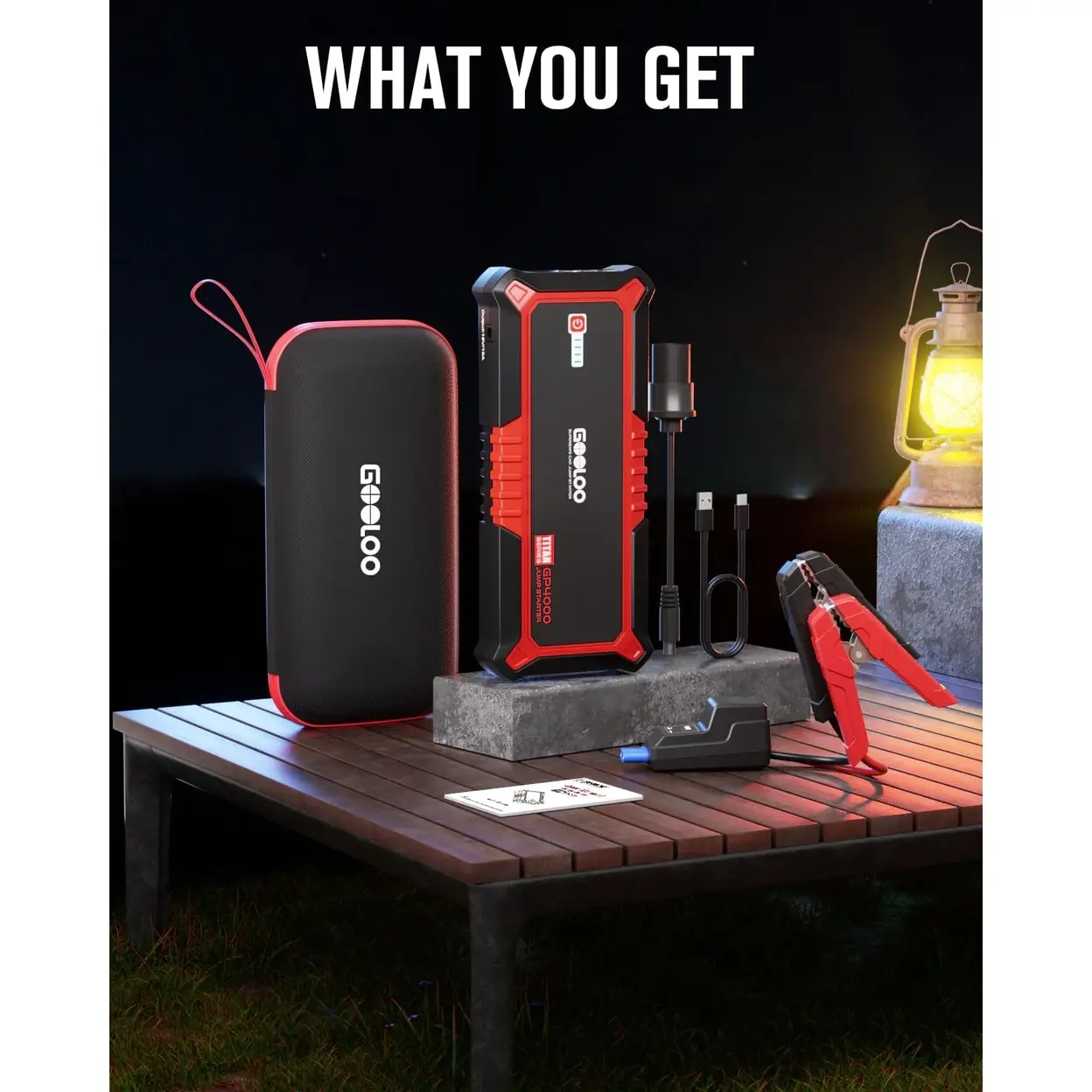 IN THE BOX - GOOLOO Heavy-Duty Portable Car Battery Jump Starter GP4000, Smart Jumper Cable, USB to Type-C Cable, Cigarette Lighter Socket Adapter, EVA Storage Case, 8 Months Warranty and Lifetime Tech Support. (Wall charger is not included)