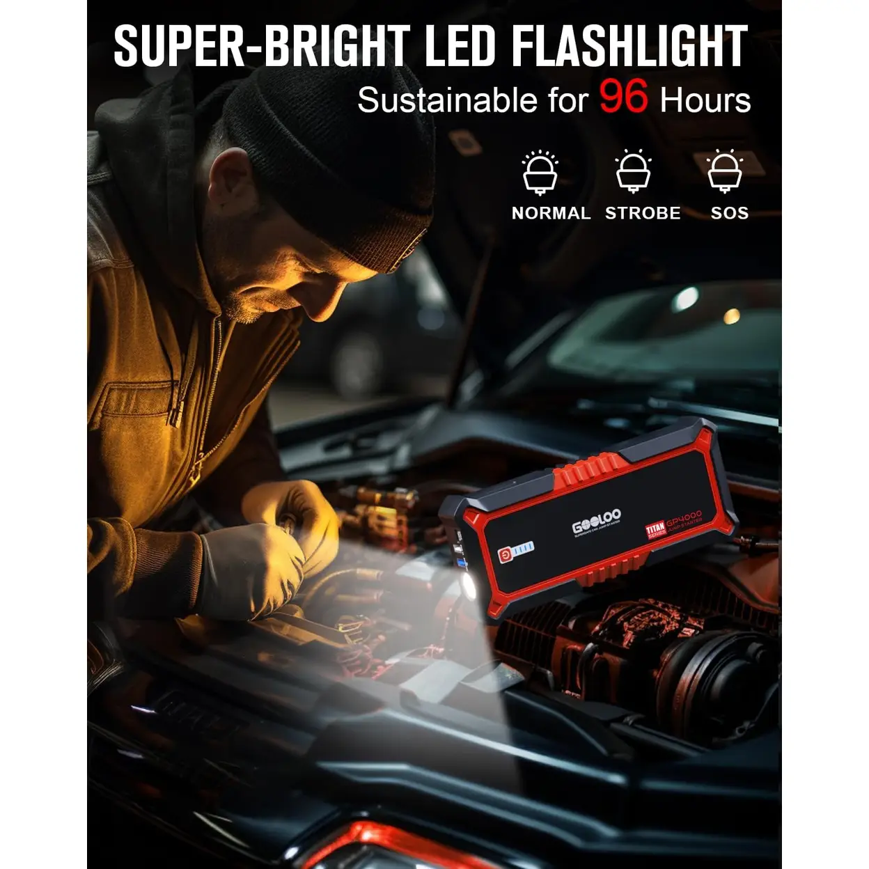 Powerful and Reliable Car Battery Jump Starter - The 4000 amp booster pack jump starter is capable of quickly jump-starting a dead car battery. Even if the battery voltage is extremely low, simply pressing the "BOOST" button will forcefully restart the car. The GOOLOO car battery charger jump starter can effectively start all gasoline engines and diesel engines up to 10.0L within mere seconds. This versatile device is compatible with 12v vehicles, motorcycles, pickup trucks, RVs, tractors, trucks, cargo vans, ATVs, snowmobiles, yachts, and various other vehicles.