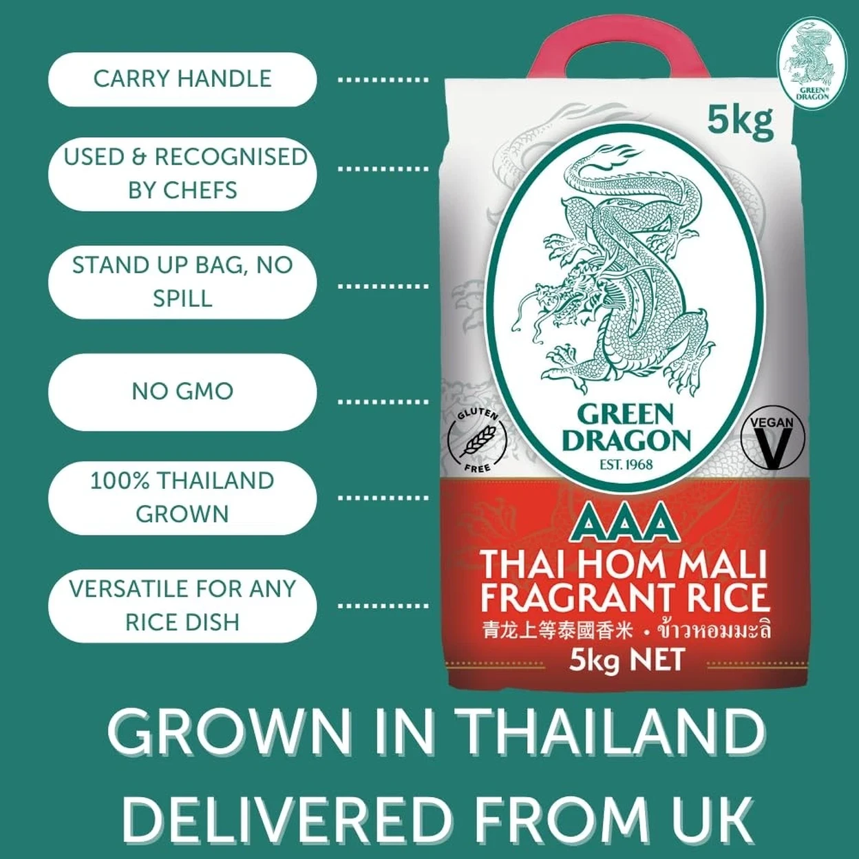 Discover the exquisite aroma and delicate texture of Green Dragon Thai Fragrant Jasmine Rice, a premium offering that embodies Thai culinary heritage.