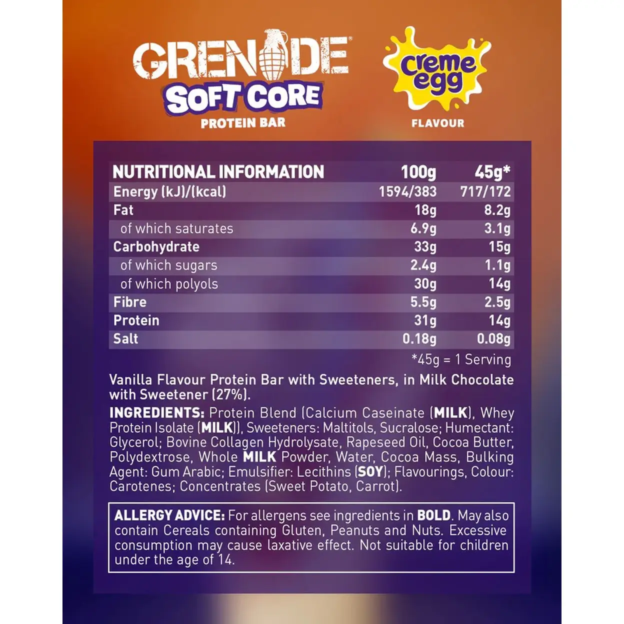 Grenade Soft Core Creme Egg Protein Bar is a high-protein, low-sugar snack featuring a unique soft, fluffy protein dough with a Creme Egg flavour filling, all coated in smooth milk chocolate.