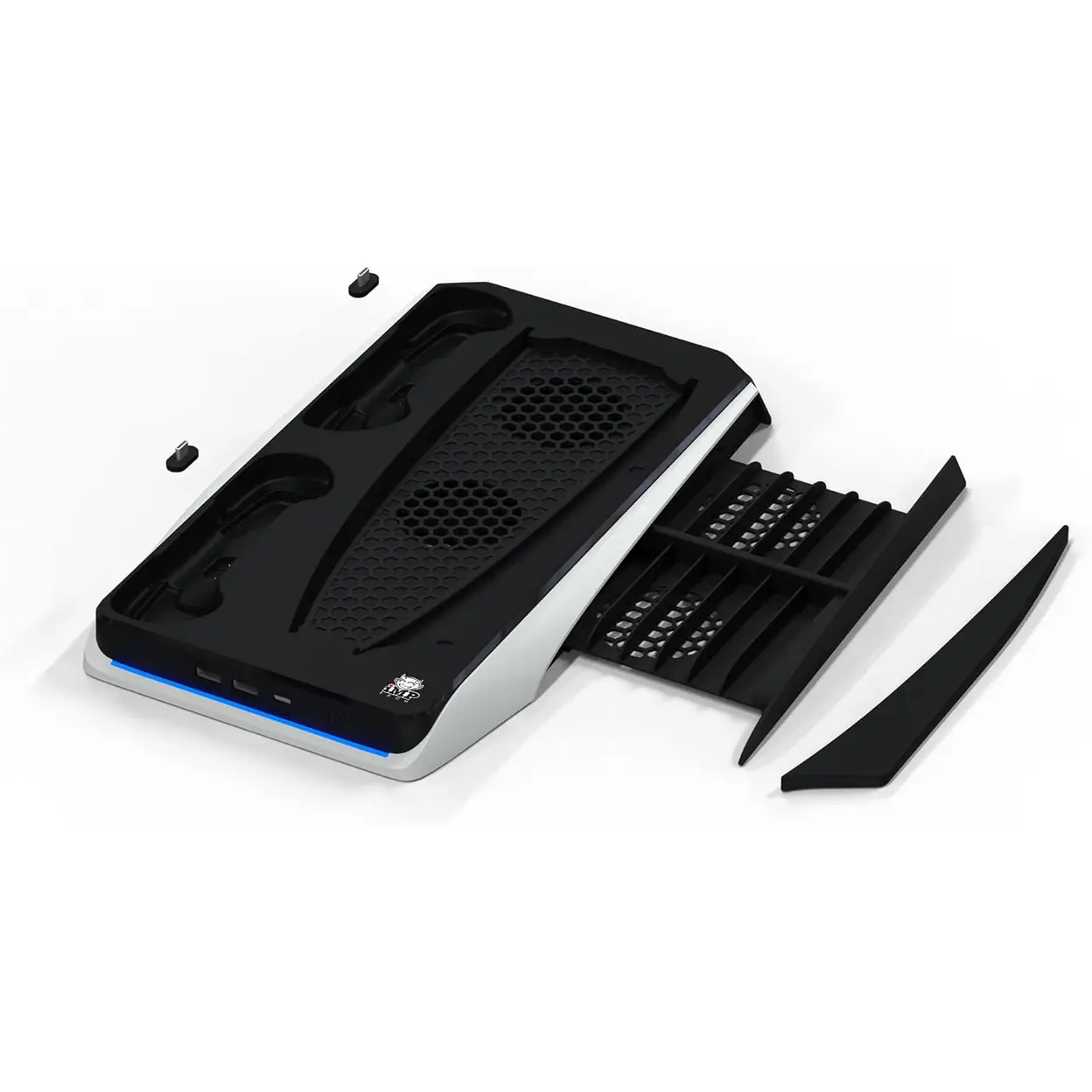 The IMP Gaming DLX Twin Charging Tower with Cooling Fan + Game Storage Stand (PS5) is a multi-function accessory designed to organise, cool and charge your PlayStation 5 setup. With dual controller charging docks, an integrated cooling fan and storage for multiple game cases, it keeps your console area tidy, cool and ready for gaming at any time.