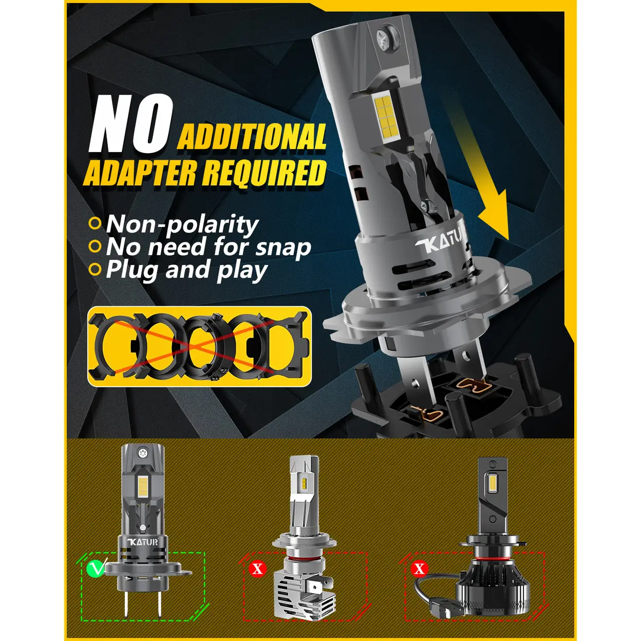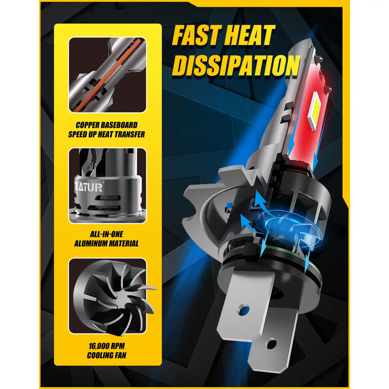 Fan: With a unique powerful 16,000RPM turbo fan, aviation aluminum lamp body, unique hollow carved heat sink design, help to dissipate the heat generated from the LED chips rapidly and effectively, and the IP65 waterproof design, all of these ensure supporting the bulbs to work up to 60000 Hours.