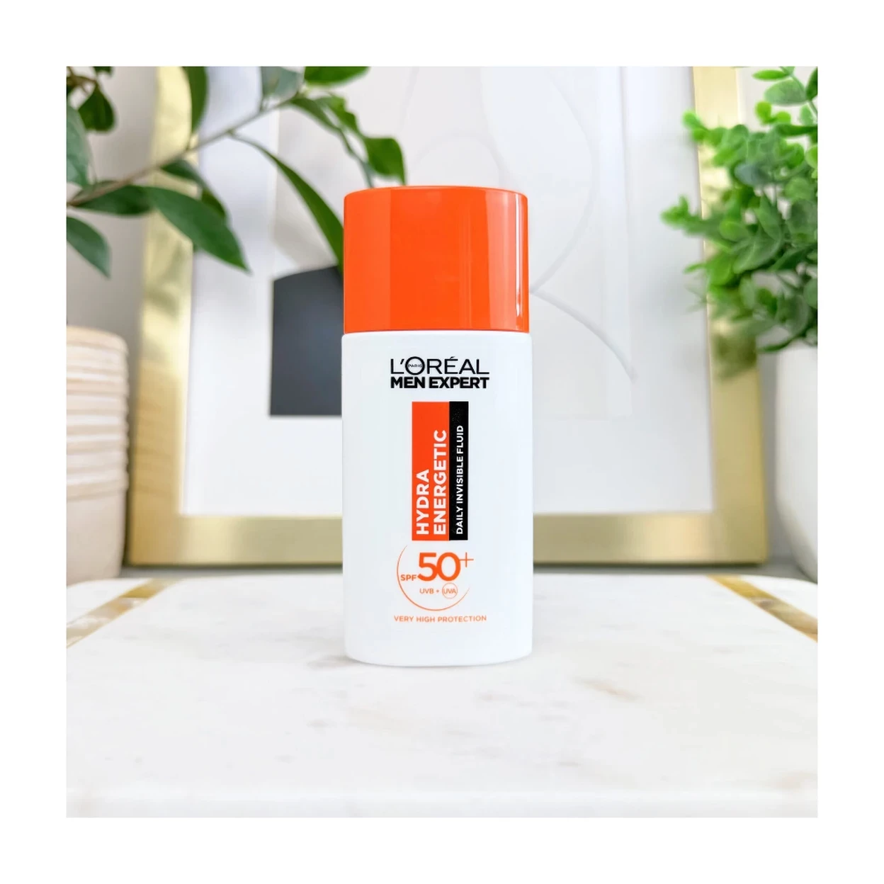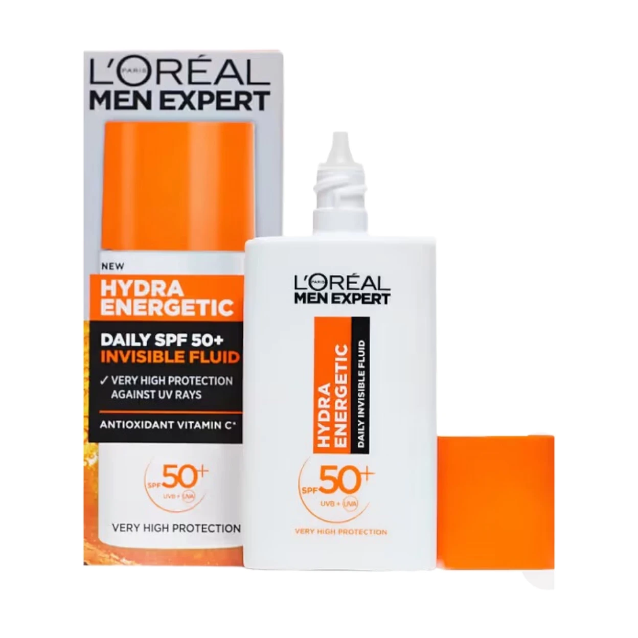 This product L'Oréal Men Expert Hydra Energetic Daily SPF50+ Invisible Fluid 50ml protects skin from UV rays to re-energise the appearance of skin. Formulated with SPF50+ and Vitamin C, it helps improve skin tone, fights against visible signs of fatigue, and helps prevent signs of ageing. In one use, skin is protected from UV rays, leaving skin feeling hydrated and smoother. In one month of regular use, skin looks revitalised and skin tone is more even. The Daily SPF50 UV Fluid features an invisible finish with no white cast, high adherence to skin, and is resistant to water and friction. It helps to prevent signs of ageing, including wrinkles, uneven skin tone and dark spots.