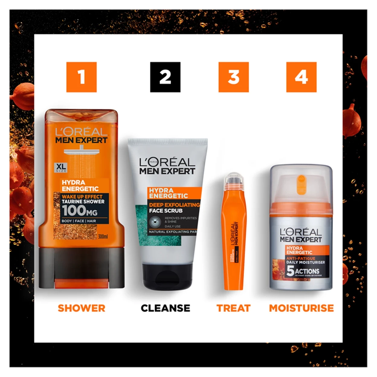 During the day, your skin can become oily, pores can become blocked, and blemishes may start to appear. L’Oréal Paris Men Expert Hydra Energetic Deep Exfoliating Face Scrub is designed for men who want to take action against these issues. This deep exfoliating scrub purifies and cleanses the skin by removing impurities and excess shine. It helps to unblock pores with natural exfoliating particles, leaving your skin feeling refreshed and invigorated. As the No.1 Men’s face care brand worldwide, L’Oréal Paris Men Expert offers trusted skincare solutions for men.