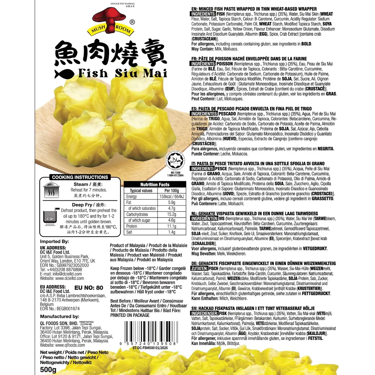 Fish (Nemipterus spp, Trichiurus spp.) (35%), Water, Siu Mai Skin (Wheat Flour, Water, Salt, Tapioca Starch, Colour: B-Carotene, Curcumin, Acidity Regulator: Sodium Carbonate, Potassium Carbonate), Palm Oil, Wheat Starch, Modified Tapioca Starch, Soya Protein, Salt, Sugar, Garlic, Yellow Onion, Flavour Enhancer: Mondosodium glutamate, Disodium Inosinate and Disodium Guanylate, Albumin (Egg), Spice, Crab Extract [ contains crab (Crustacean)].