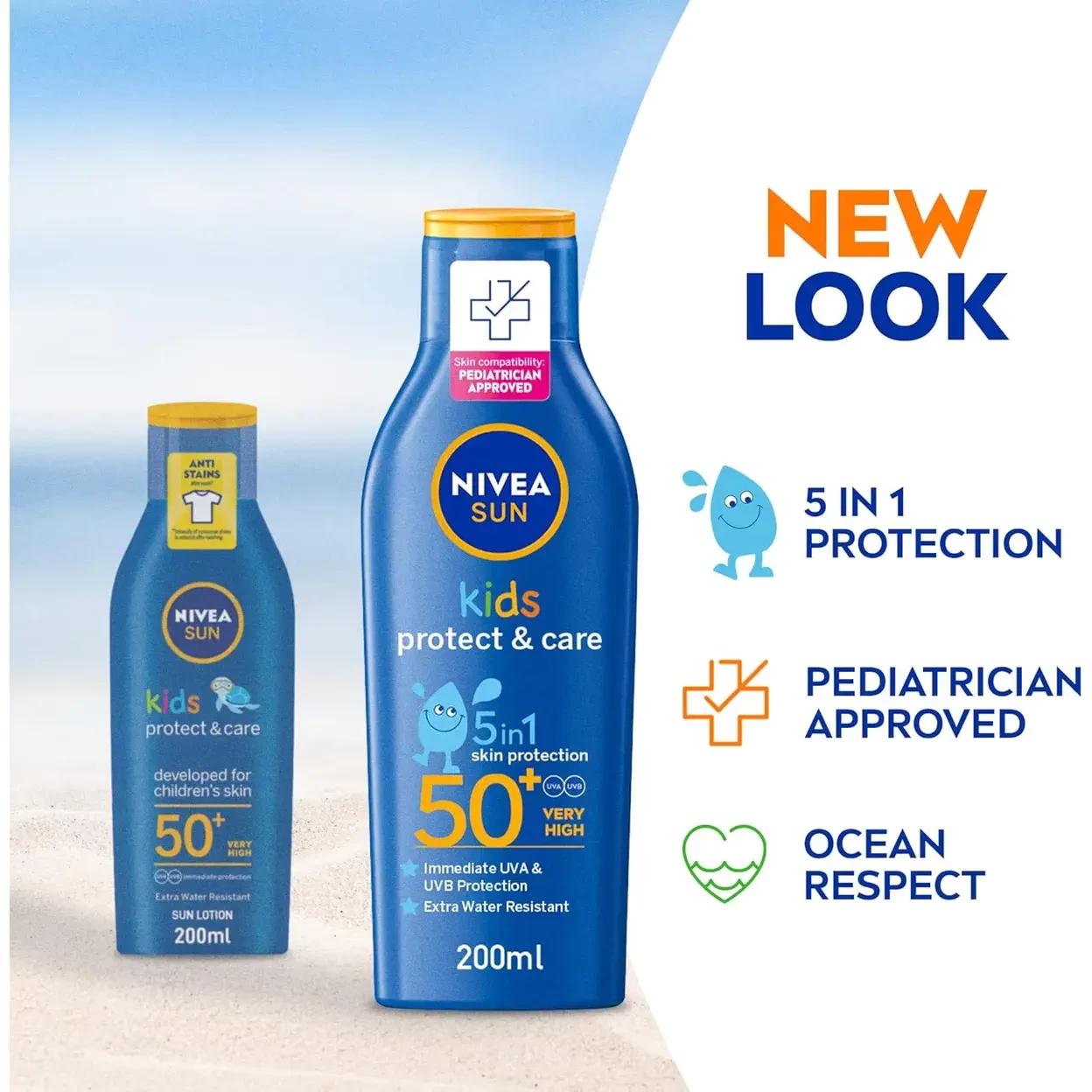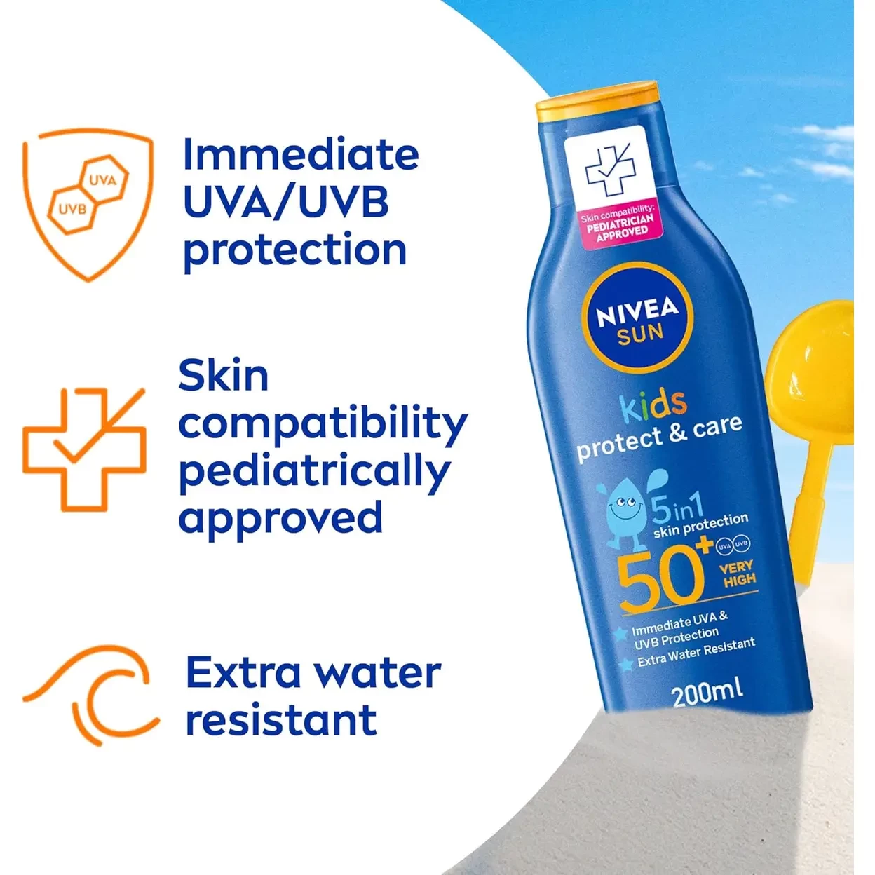 NIVEA Kids Protect & Care Lotion SPF 50+ is designed to provide highly effective sun protection for your child¡¯s delicate skin. With immediate protection against UVA and UVB rays, this lotion helps prevent sunburn and long-term UV damage while being extra water-resistant for all-day play. The formula supports the skin¡¯s protective barrier and provides long-lasting moisture, reducing the risk of sun allergies. Developed specifically for children aged 3 and up, it is pediatrically approved for skin compatibility. This eco-friendly product is 77% biodegradable and respects the ocean by avoiding harmful UV filters and microplastics.