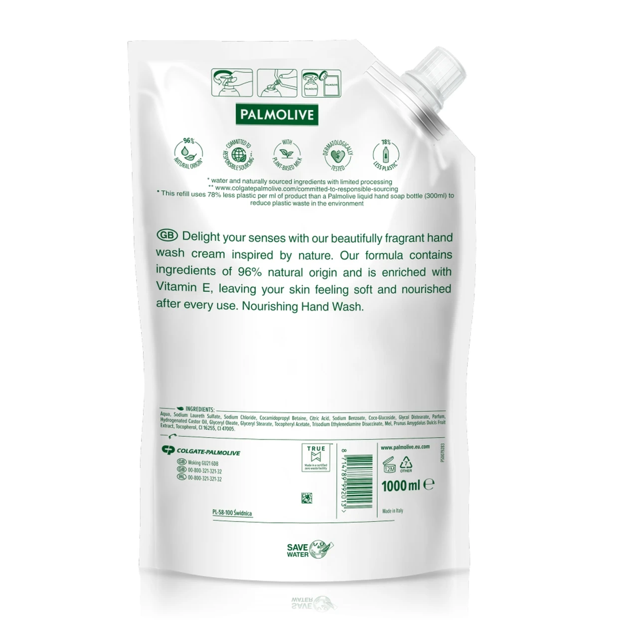 Palmolive Naturals Milk & Honey Handwash Refill offers a luxurious hand washing experience enriched with the soothing scent of honey and the nourishing properties of almond milk. Inspired by nature, this handwash is crafted to delight your senses while leaving your hands feeling soft and nurtured. Enriched with vitamin E, it provides a nourishing touch every time you wash your hands. The formula is composed of 96% natural origin ingredients and is 98% biodegradable, ensuring an eco-friendly choice for conscientious consumers. The refill pack is designed to use 82% less plastic than a standard 300ml bottle, significantly reducing plastic waste and its impact on the environment.