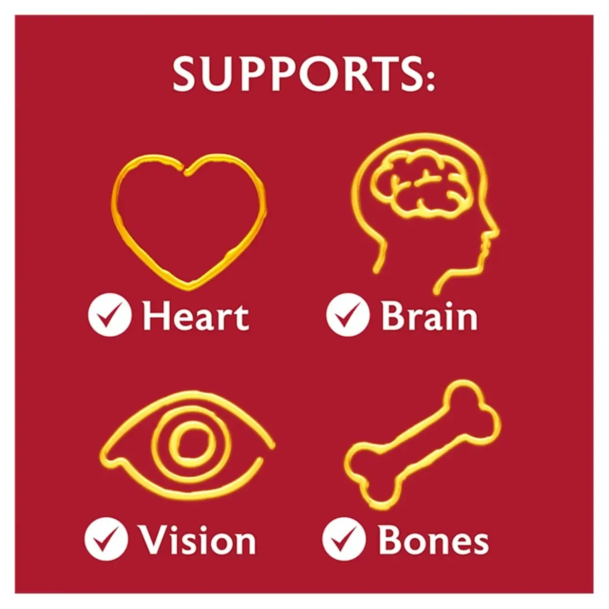 Supports bone health with vitamin D, contributes to normal heart function with EPA and DHA, and maintains normal vision and brain function with DHA.