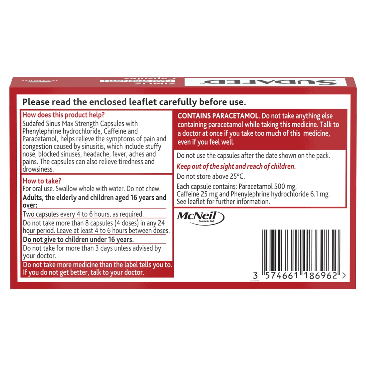Contains multiple active ingredients: Phenylephrine to reduce swelling, Paracetamol for pain/fever, and Caffeine to combat tiredness.