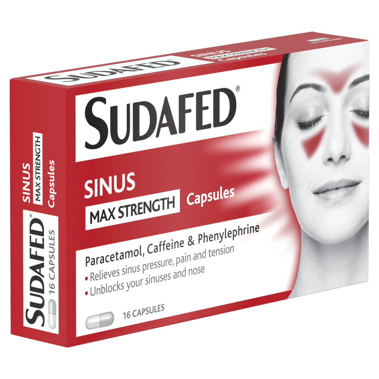 This product is Sudafed Sinus Max Strength Capsules. It is an over-the-counter medicine formulated to provide comprehensive relief from sinus congestion and its painful symptoms. The capsules combine a decongestant (Phenylephrine Hydrochloride) to shrink swollen nasal and sinus passages, a painkiller/fever reducer (Paracetamol), and Caffeine to help counteract fatigue. This multi-symptom approach is designed to relieve pressure, pain, headaches, and fever, helping you breathe more freely and feel more alert while recovering.