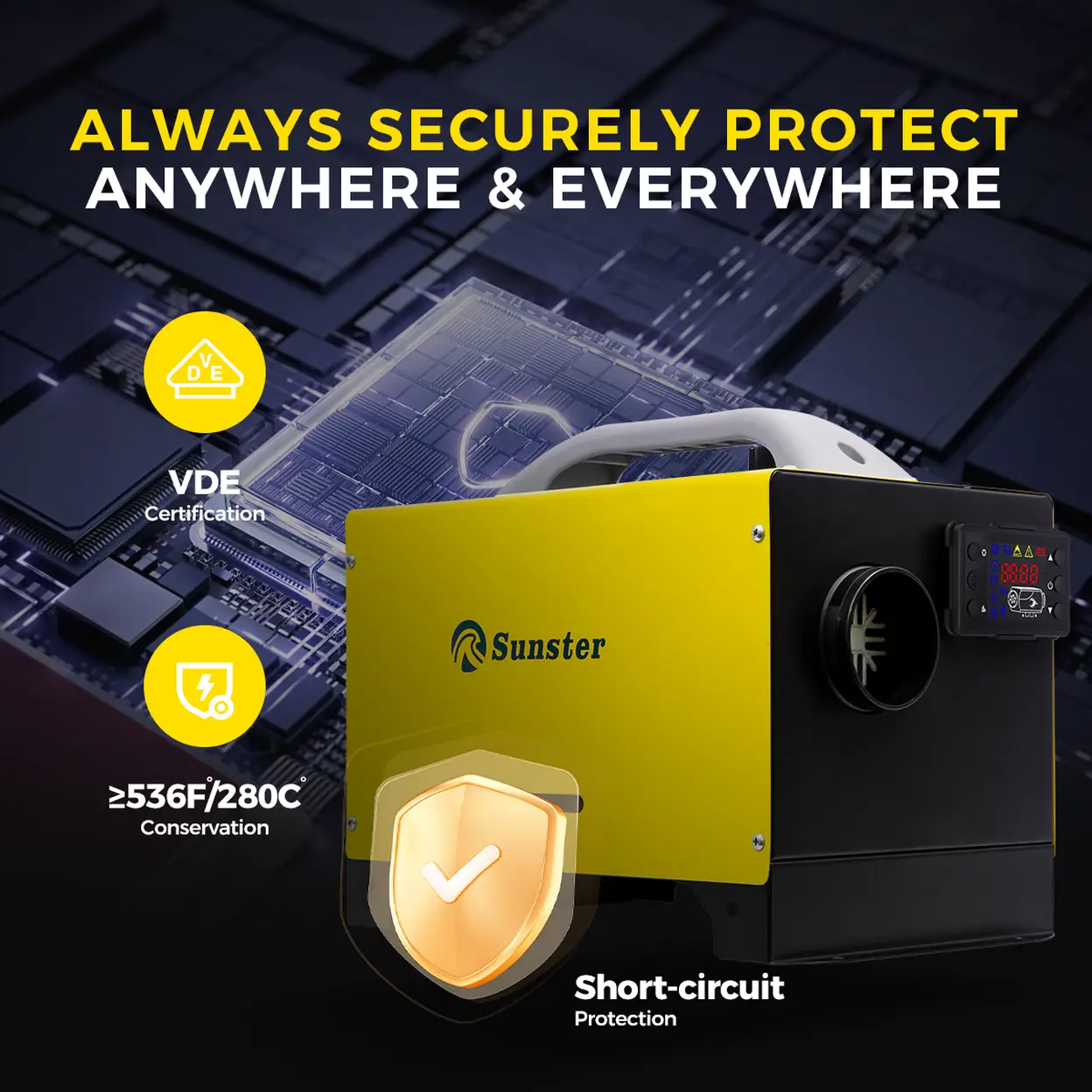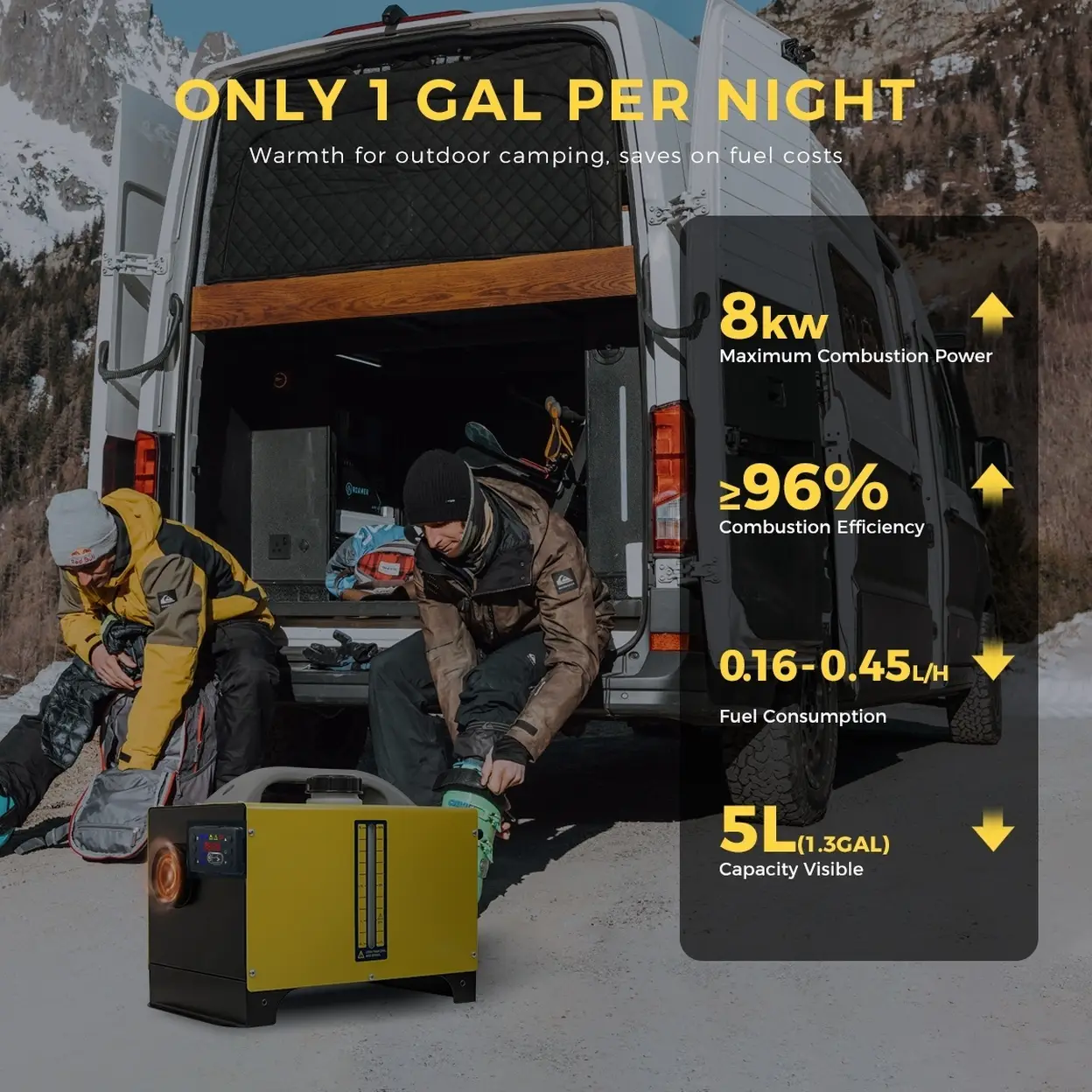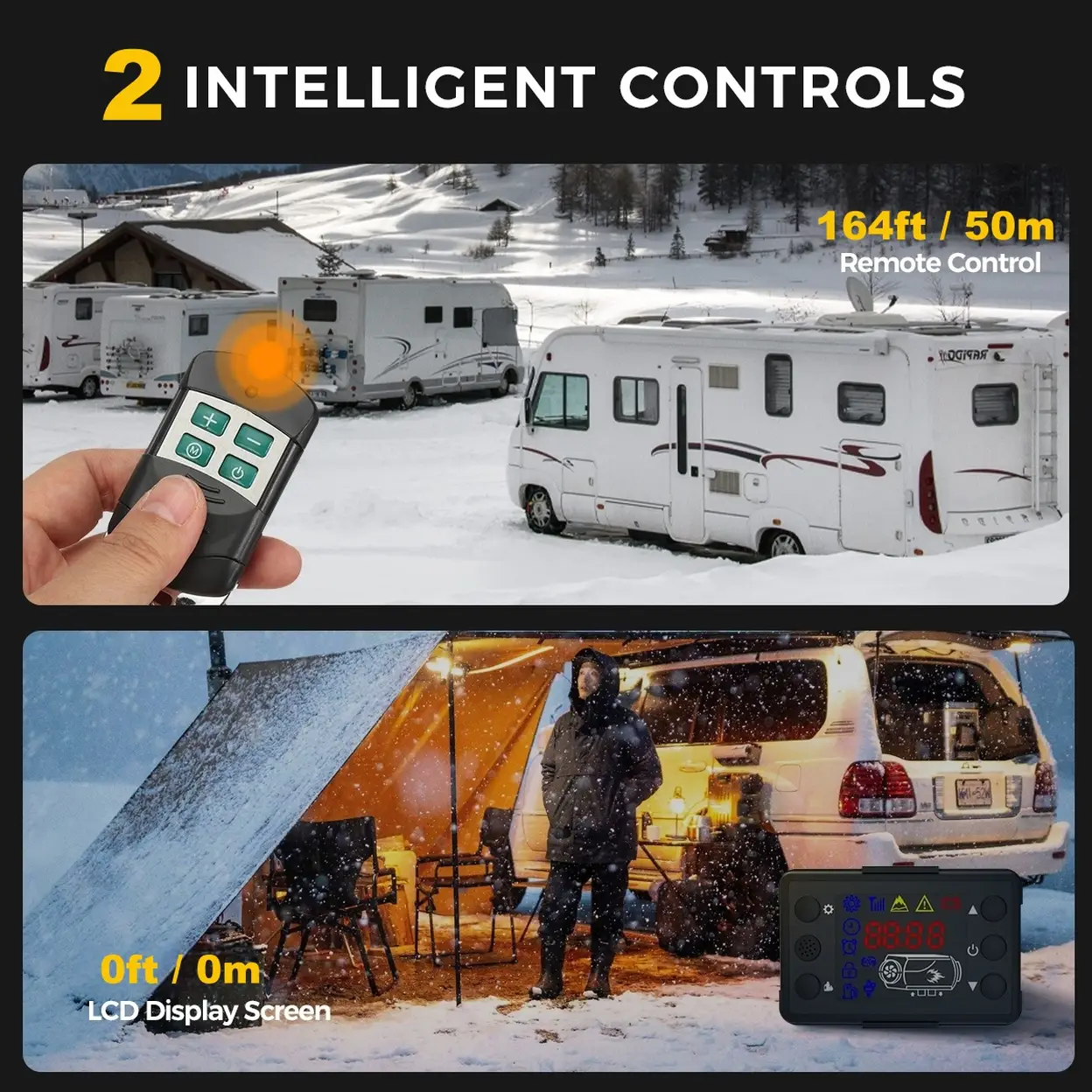 ✅【Two Control Methods】Our heater has two control modes, which can be controlled by a wireless remote control to preheat or adjust the temperature within a distance of 164 feet/50 meters. It also comes with an LCD display screen, so you can choose the controls that suit you. The temperature adjustment range is 46 ° F-96.8 ° F/8 ° C-36 ° C to meet your different needs. . ✅【Universal Dual Power Input (12V/24V DC & 110V-240V AC)】Sunster diesel heater compact automatically switches between vehicle and household power, allowing you to use it both on the road or at home. Perfect for those looking for versatile heating solutions across various settings. ✅【Warmth Everywhere】 Our diesel heater is designed for smooth operation at elevations up to 9843 ft/3000 m. The temperature can be adjusted from 46 °F-96.8 °F/8 °C-36 °C, catering to your needs. Whether at high altitudes or low temperatures, this diesel heater can be easily installed and secured in your vehicle or indoors to provide continuous warmth wherever you go. ✅【Low Fuel Consumption&Low Noise】 Our diesel heater has a power range of 5-8kw with a heating efficiency of ≥90%. It consumes only 1 GAL of diesel per night to keep a large area of 215ft²/20㎡ continuously warm. It features built-in intelligent thermostat control and high-quality muffler for low noise ≤75dB, ensuring a comfortable sleep in RVs and outdoor camping without being disturbed by the cold. ✅【Easy & Flexible Installation 】Our heater comes with a complete mounting package, including all essential parts, pipes, and tools. It is easy to use and can be flexibly installed in multiple locations on your vehicle. ✅【Comprehensive Safety Features】Engineered with multiple safety protections, including over-heating, short-circuit, reverse connection, and over-voltage safeguards, this portable diesel heater ensures safe and reliable operation in any environment