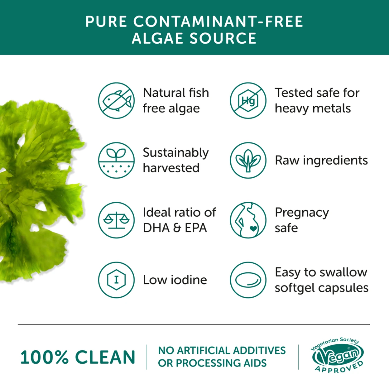 Its key benefits include supporting brain, eye, and cardiovascular health with natural DHA and EPA, being free from fish oil contaminants, featuring antioxidant protection for formula stability, and offering a vegan-friendly, sustainable alternative to fish oil.