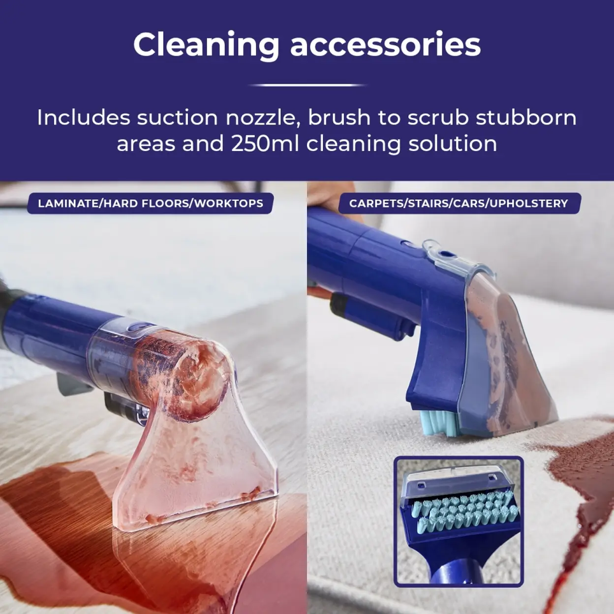 • Includes a 1.2m flexible hose, suction nozzle, and brush attachment for reaching awkward areas and scrubbing tough stains.